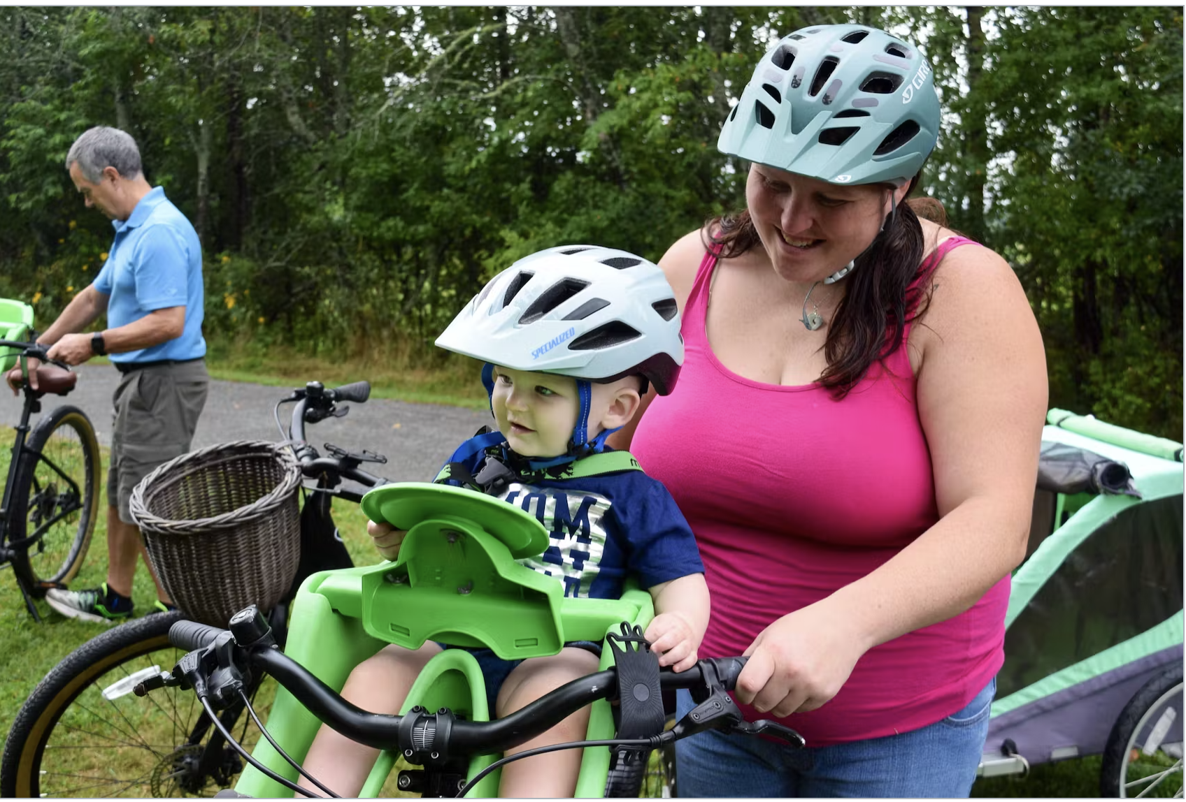 Connecting with other caregivers who bike with their littles is a great way to build community! Cycle Nova Scotia (Previously Bicycle Nova Scotia) has in the past hosted workshops for New Mothers and Caregivers to become more comfortable cycling. Try connecting with local family resource centers in the area to see if there are any connections with cycling organizations, or try reaching out directly to cycling organizations to see if they have any support in place when beginning to bike with littles.Woman and baby on a front-loading bike seat. Photo taken by Ally Lord.