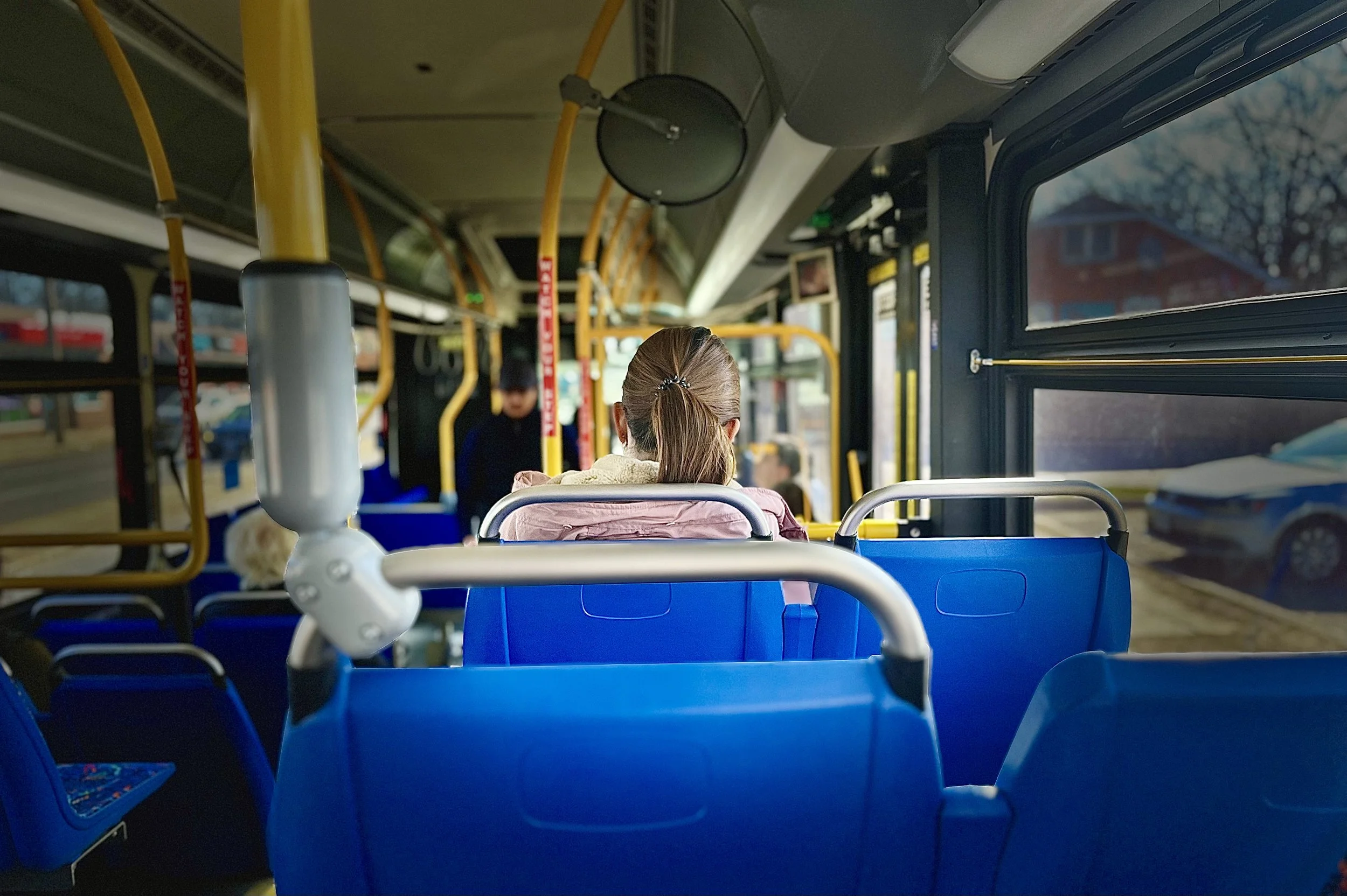 Woman riding on city bus (Photo by: D. O’Reilly. London, Ontario in Spring 2023)