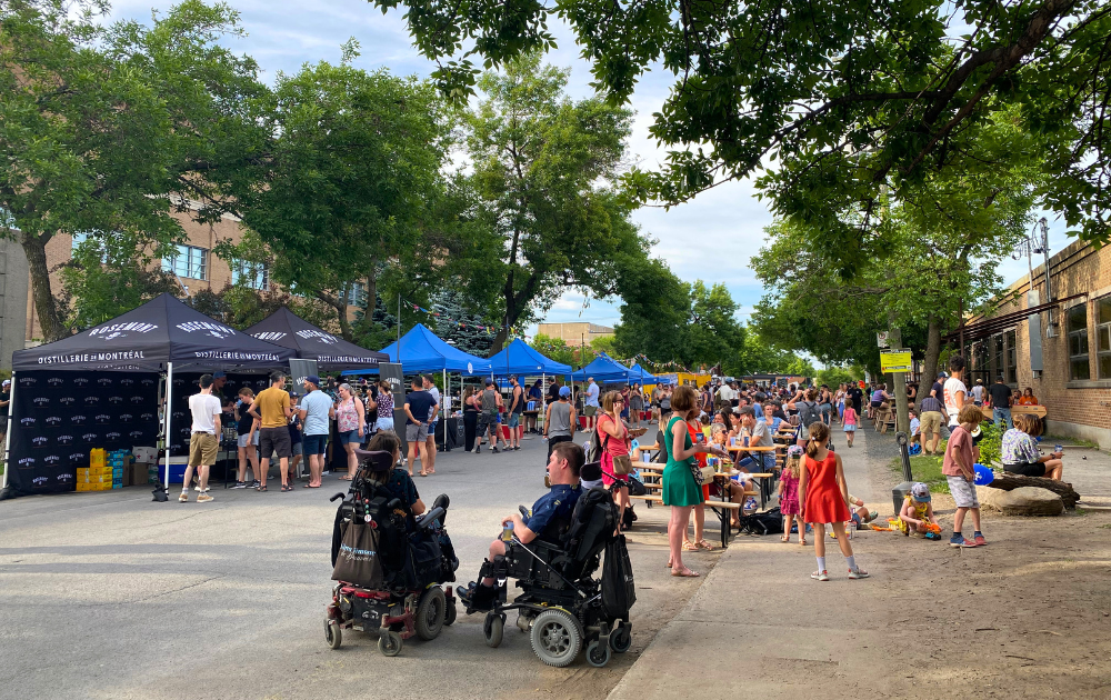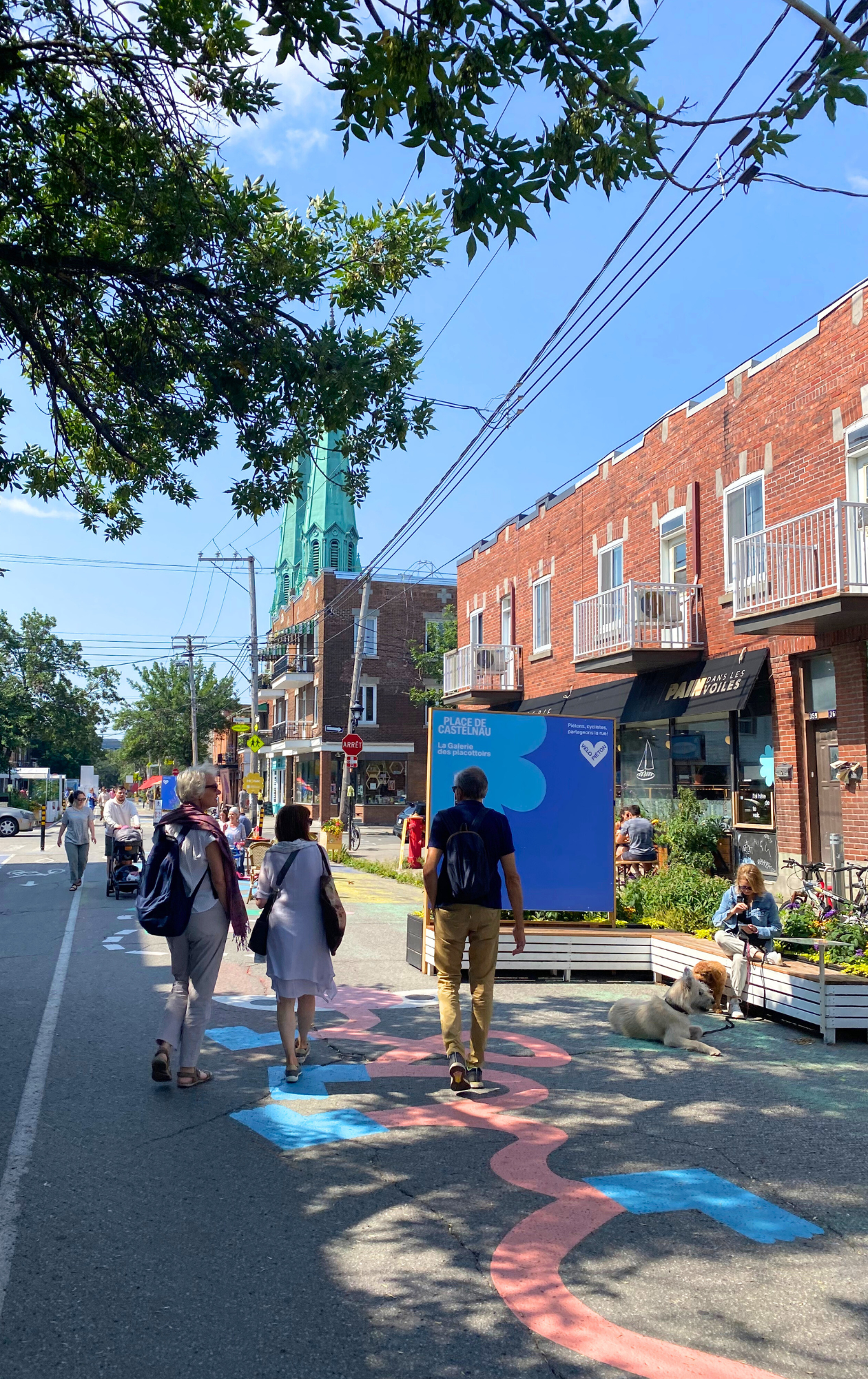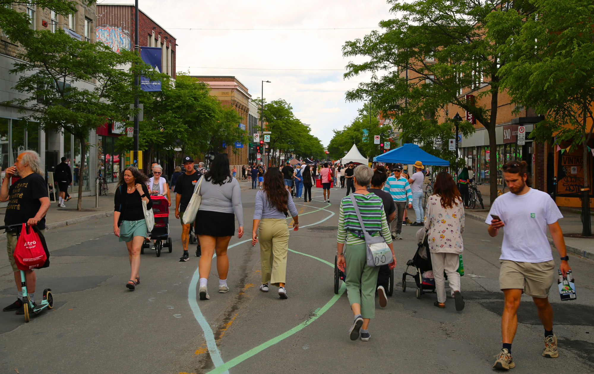 People of all ages and abilities enjoying the street activation on Mont-Royal Avenue in Montreal, QC free of all cars. Photo taken by Holly Hixson, 2024.