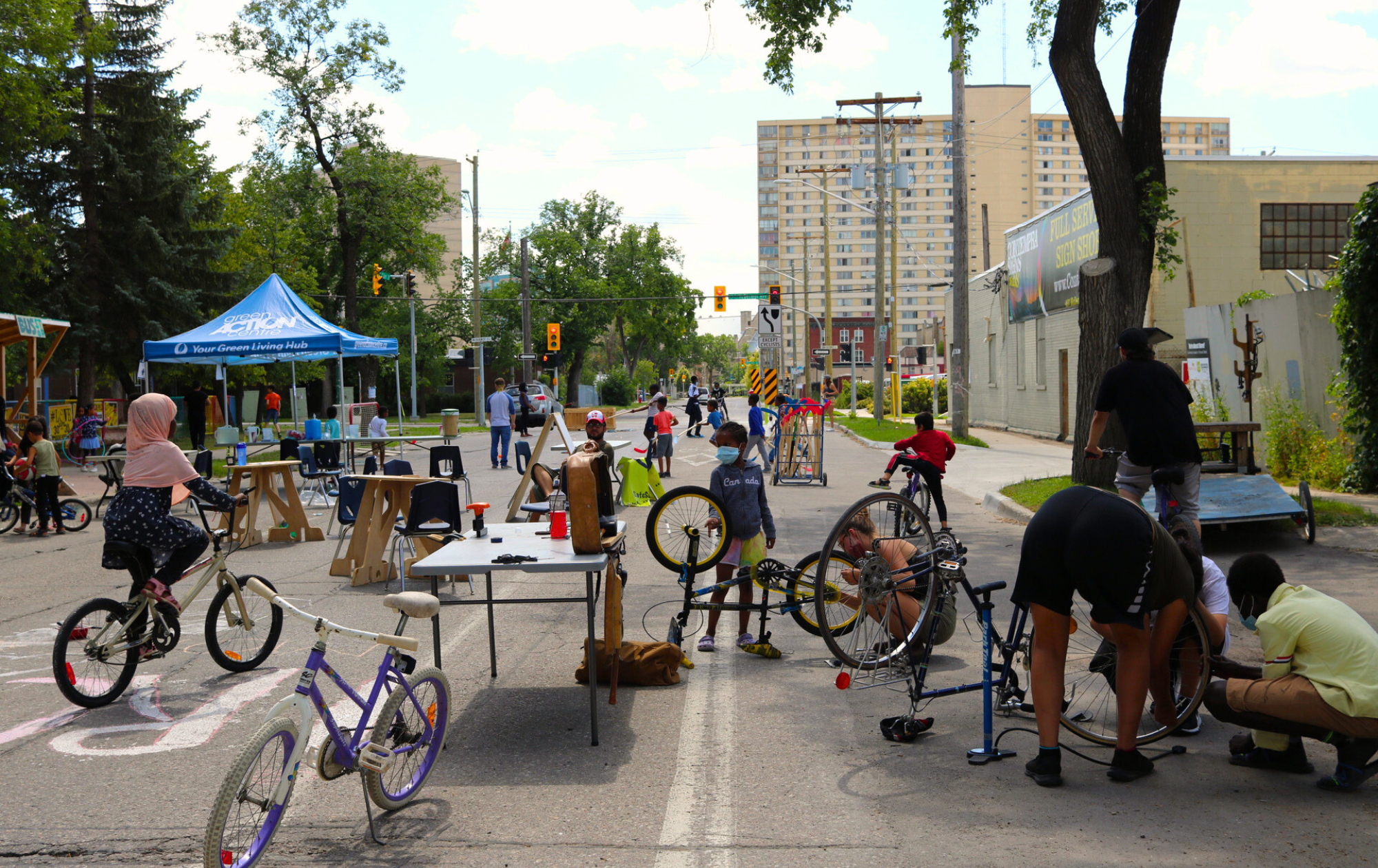 Car collisions cause hundreds of thousands of preventable injuries and deaths per year. In Canada, walking and biking make up only around 6 percent of the overall transportation mode share, yet comprise nearly 18 percent of traffic fatalities and 19 percent of serious injuries on the road. This means that people walking and biking are disproportionately impacted by the dangers that cars present on our roads. Closing a street off to cars opens up new opportunities for safely playing, socializing, learning, and building community. Photo taken by Nicole Roach on behalf of Green Action Centre at the Love30on30 bike-focused event in Winnipeg, MB 2020.
