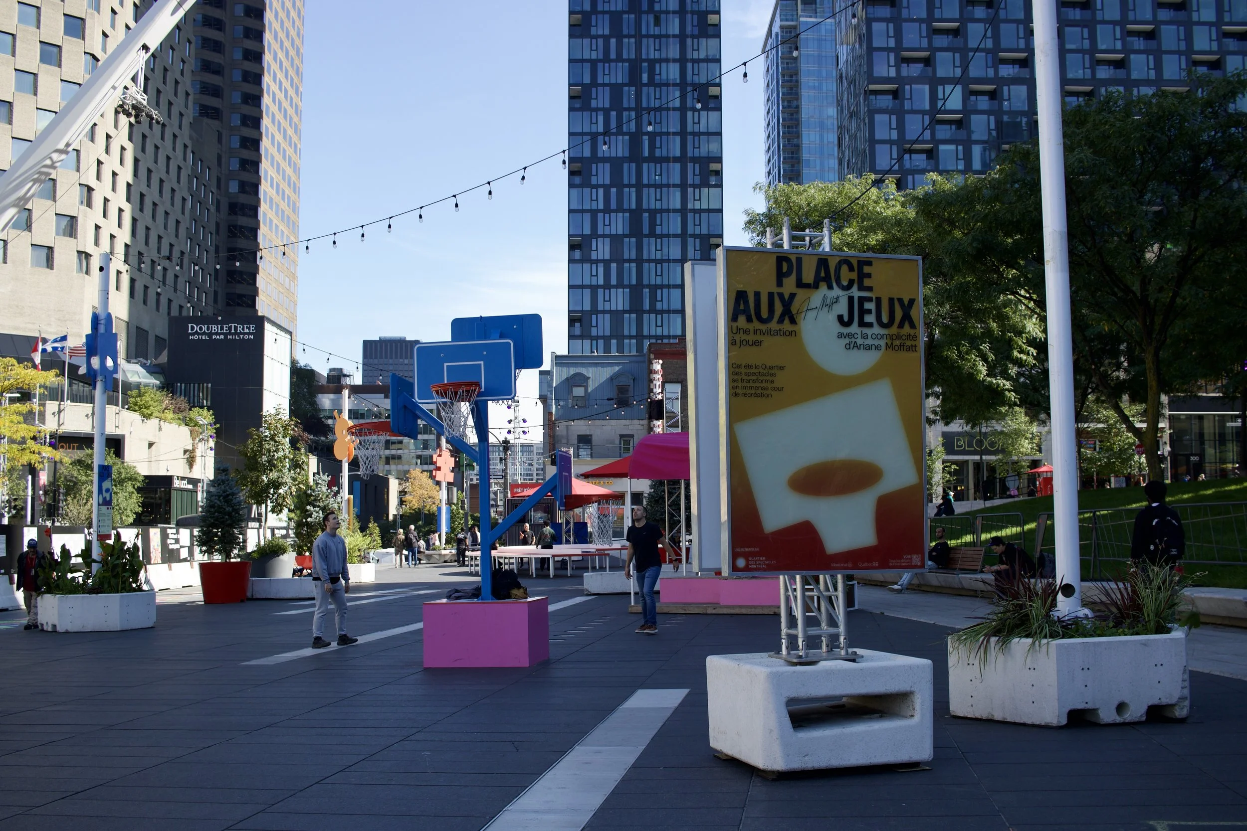 “Place Aux Jeux” installation featuring basketball hoops, ping pong tables, and artwork (photo taken by Nicole Roach in Montreal, Quebec).