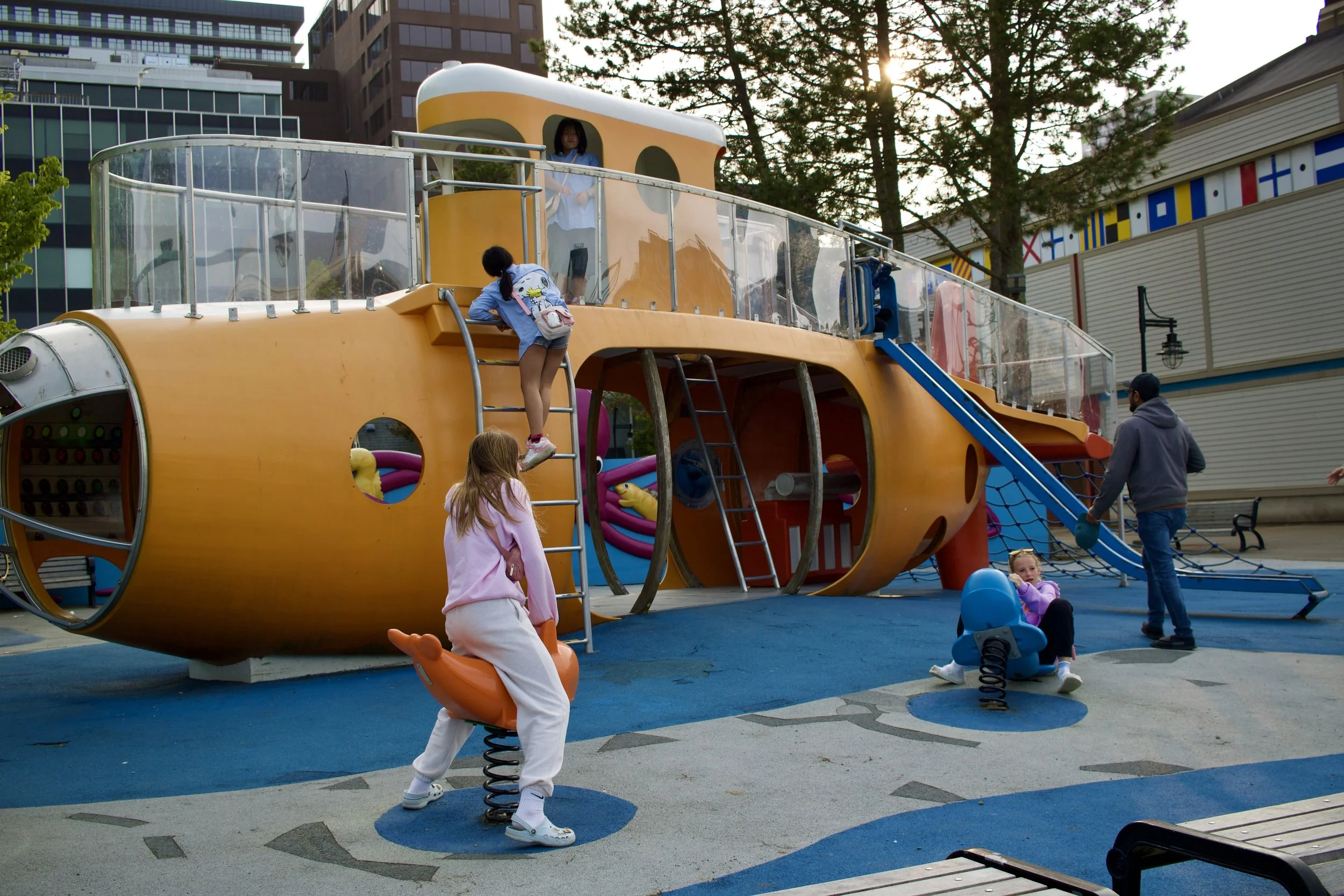 Children playing in a “Submarine Playground” along Halifax’s waterfront. Local children helped create the concept for the octopus wall and submarine, which includes a slide, periscope, portholes, and a wheelchair accessible first level (photo taken by Nicole Roach in Halifax, Nova Scotia).