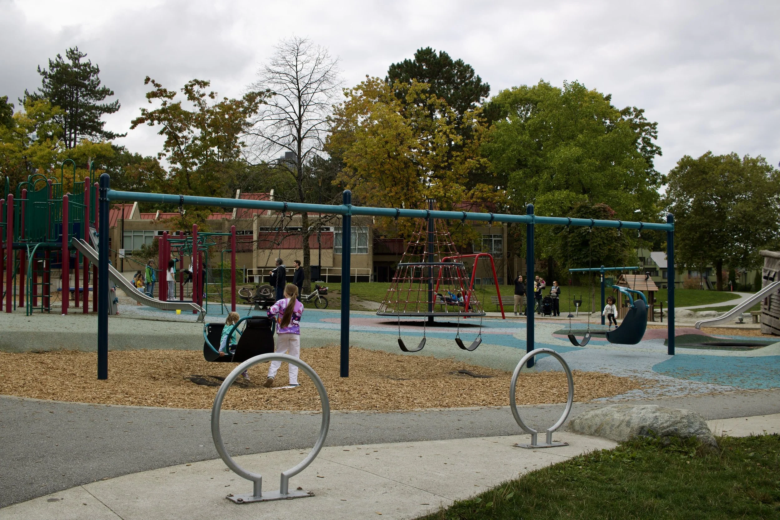 Various types of swings, including one accessible, in Charleson Park Playground (photo taken by Nicole Roach in Vancouver, British Columbia).
