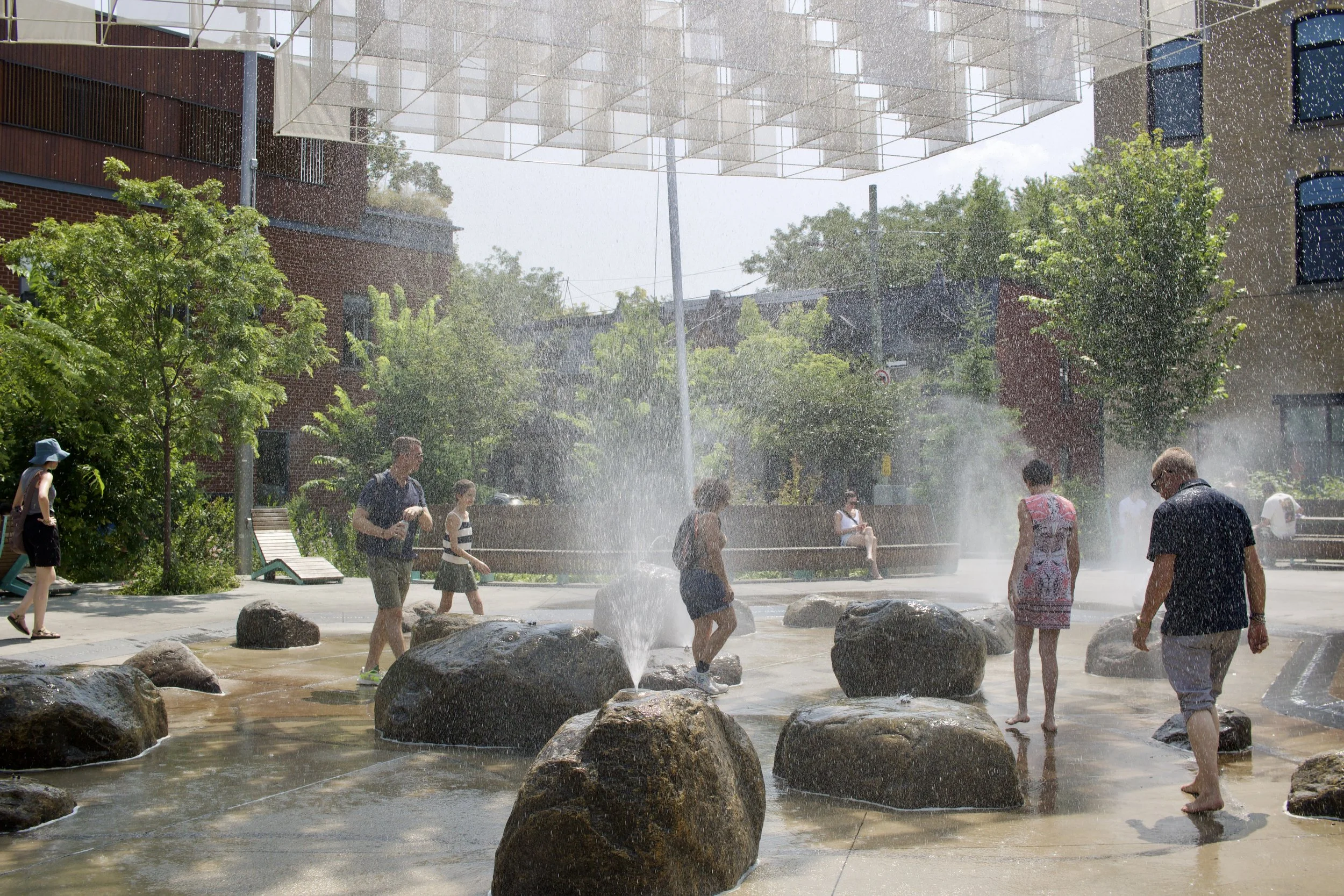 Water spray feature in “Place des Fleurs-de-Macadam” parkett (photo taken by Nicole Roach in Montreal, Quebec).