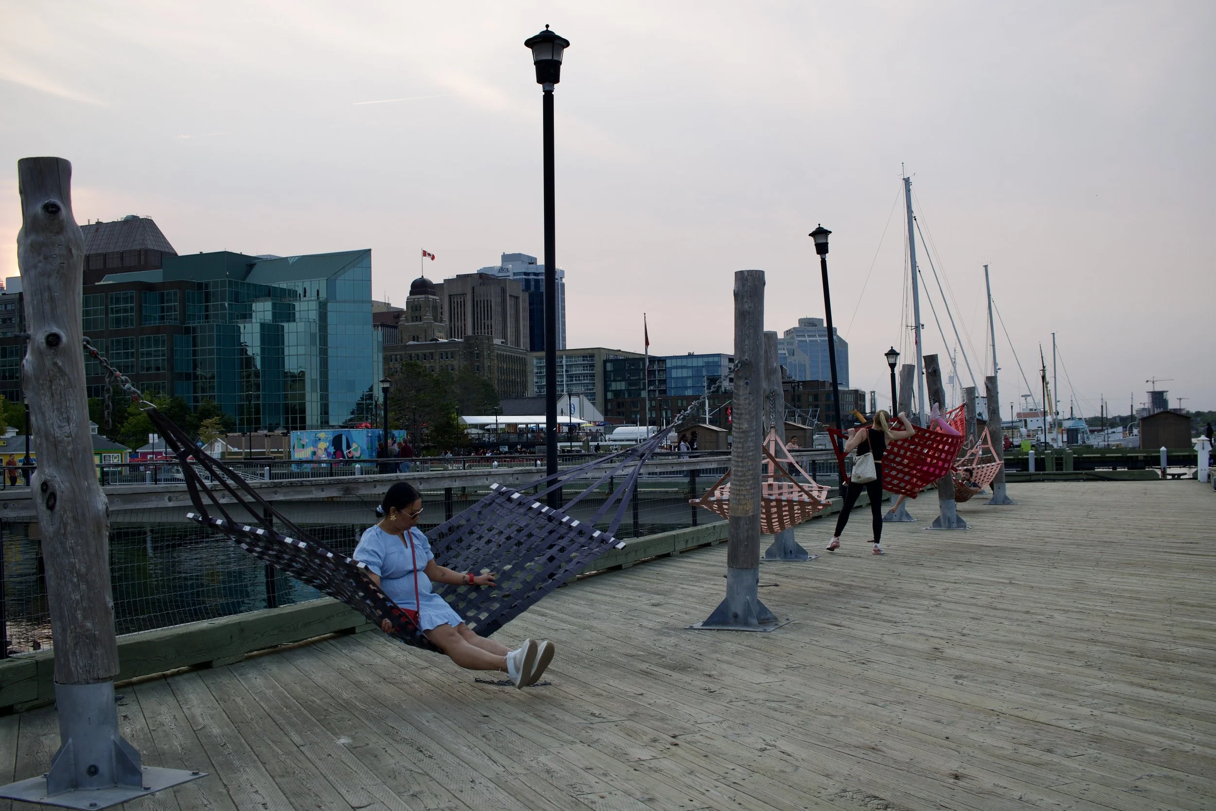 People relaxing and playing on public Waterfront Hammocks on Salter Boardwalk that enable swinging (photo taken by Nicole Roach in Halifax, Nova Scotia).