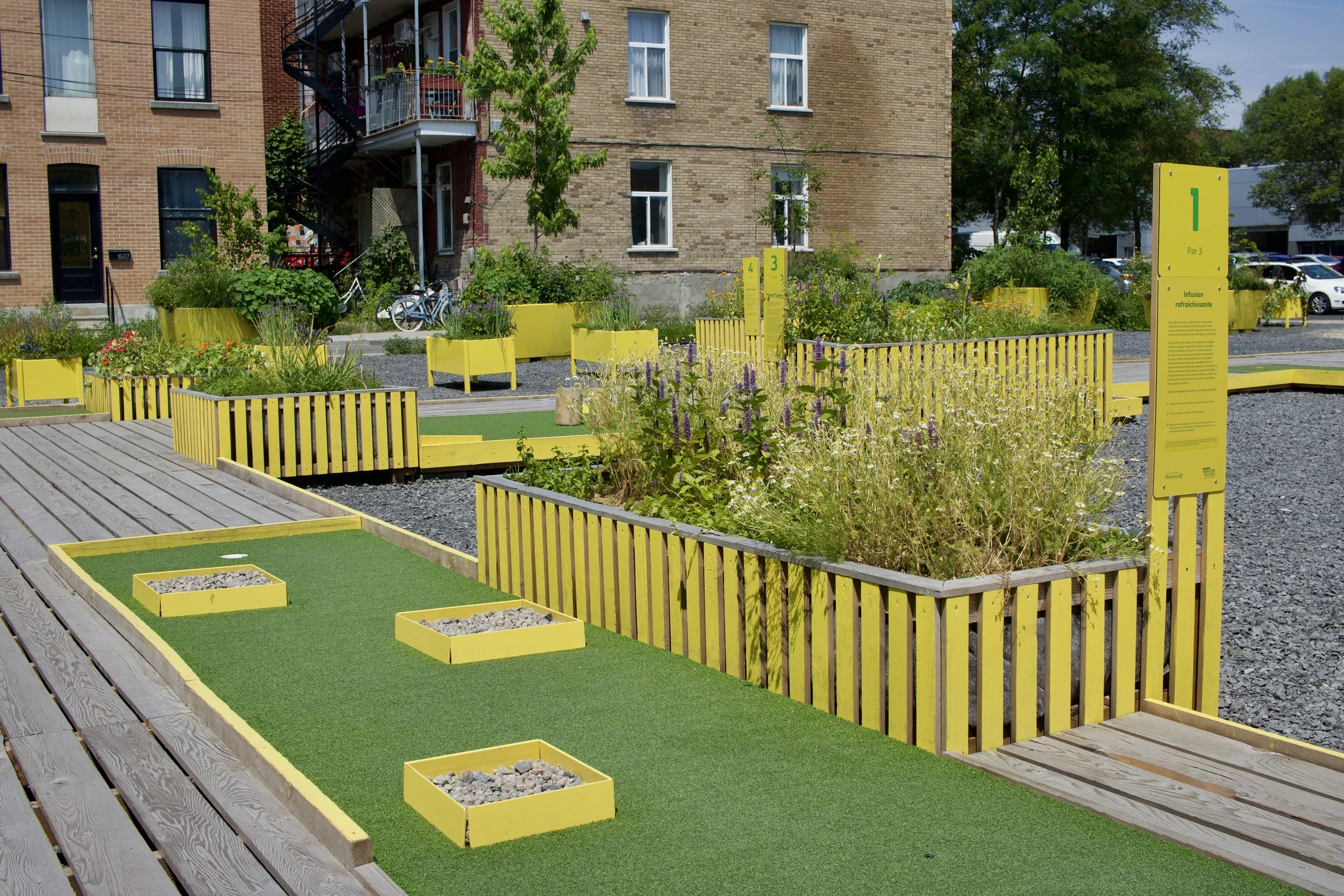 Mini golf course in “Jardins du Petit-Laurier” corner lot (photo taken by Nicole Roach in Montreal, Quebec).