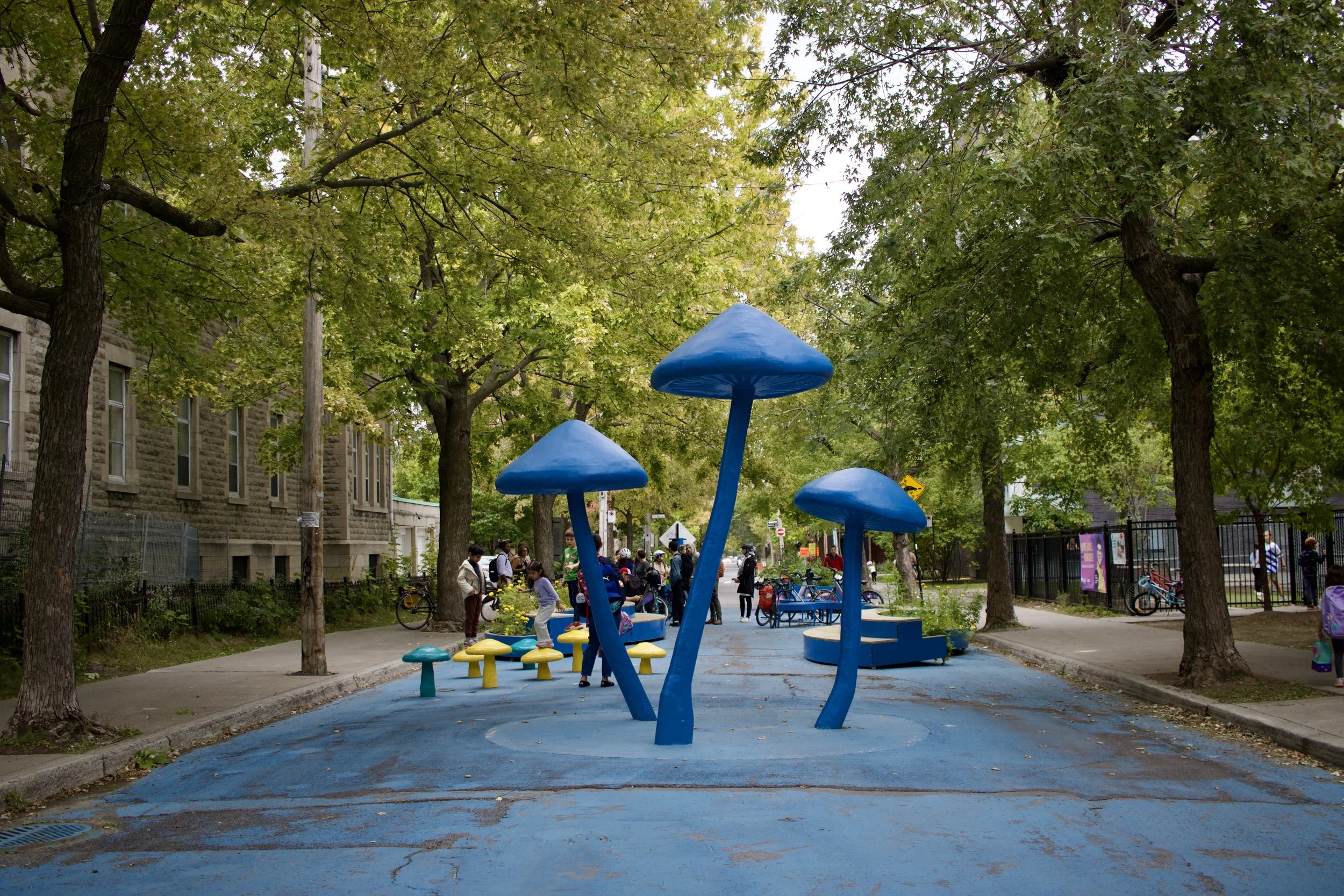 Permanent pedestrianized street “Place de L’Ange-Cornu” located in front of school, featuring mushroom art installations, seating, greenery, and lots of paint (photo taken by Nicole Roach in Montreal, Quebec via Green Communities Canada).