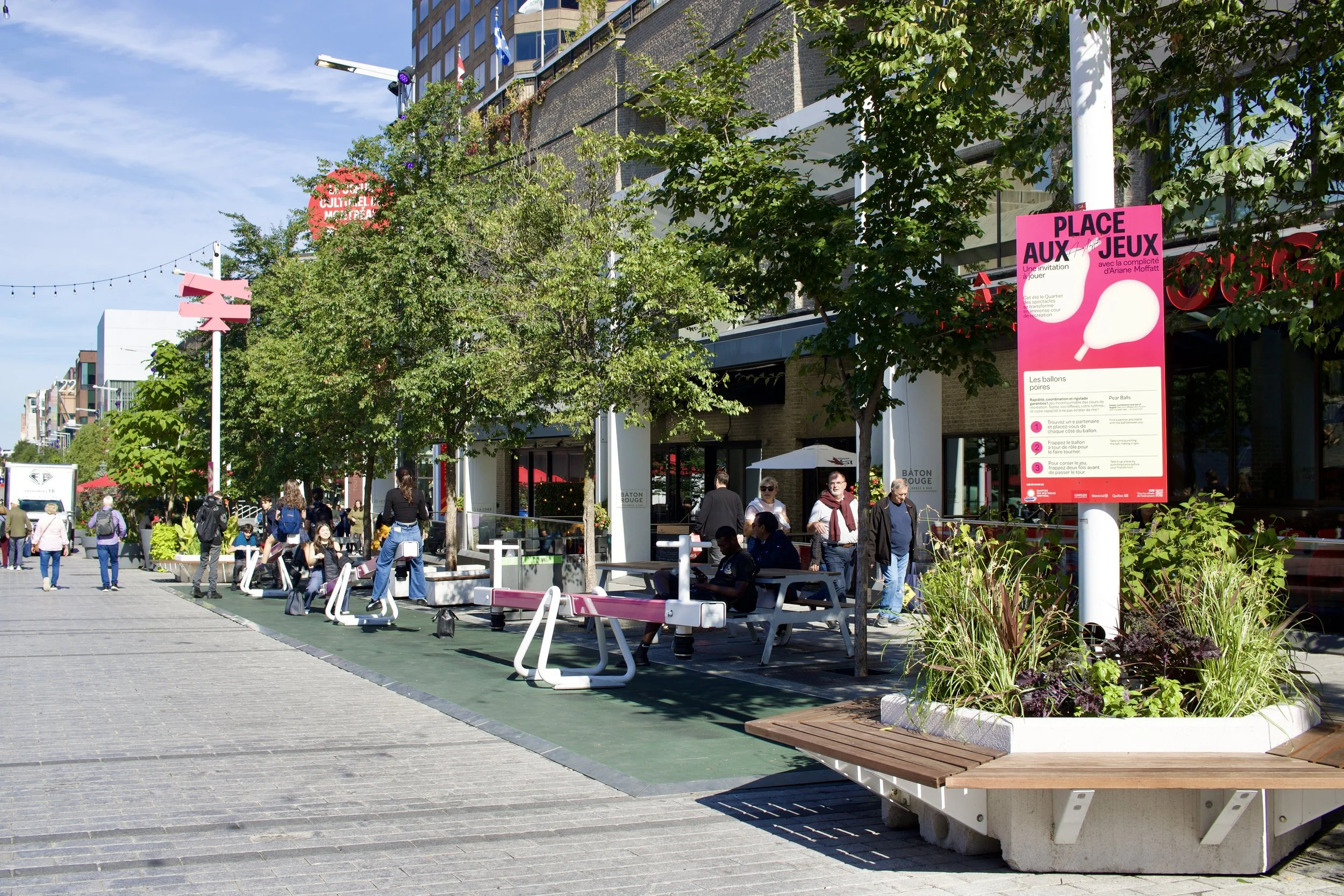 Montreal is a leader in designing safe, inclusive, and beautiful public spaces. The City and community groups have been supporting plazas, pedestrianized streets, public art, game installations, and so much more to incorporate play into the every day. Place aux Jeux at Quartier des Spectacles is a notable example where the City collaborated with local artists to animate public spaces for festival-goers and visitors during the summer months.