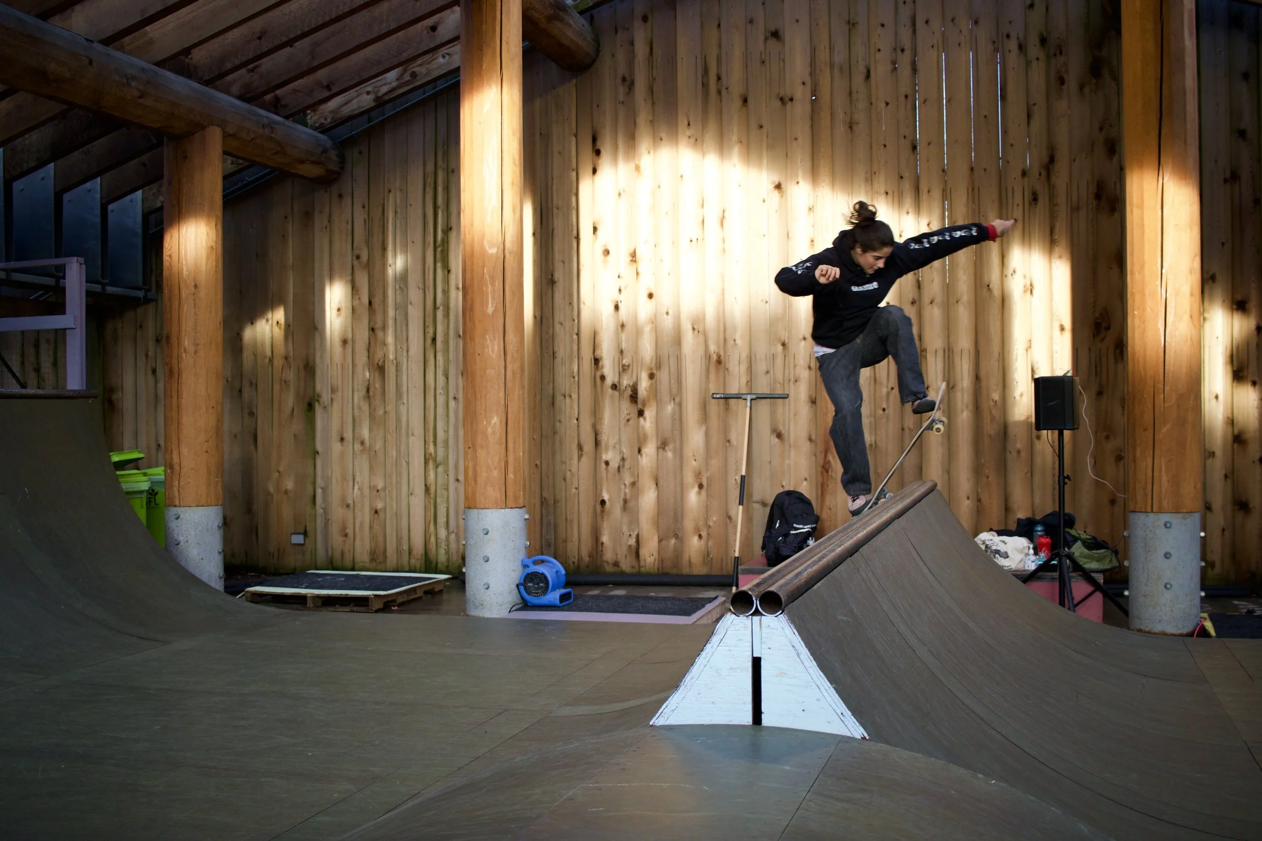 Publicly accessible indoor skatepark called the “Green Ramp” on Granville Island. It is operated during the winter months and is managed by volunteers from the Vancouver Skateboard Coalition (photo taken by Nicole Roach in Vancouver, British Columbia).