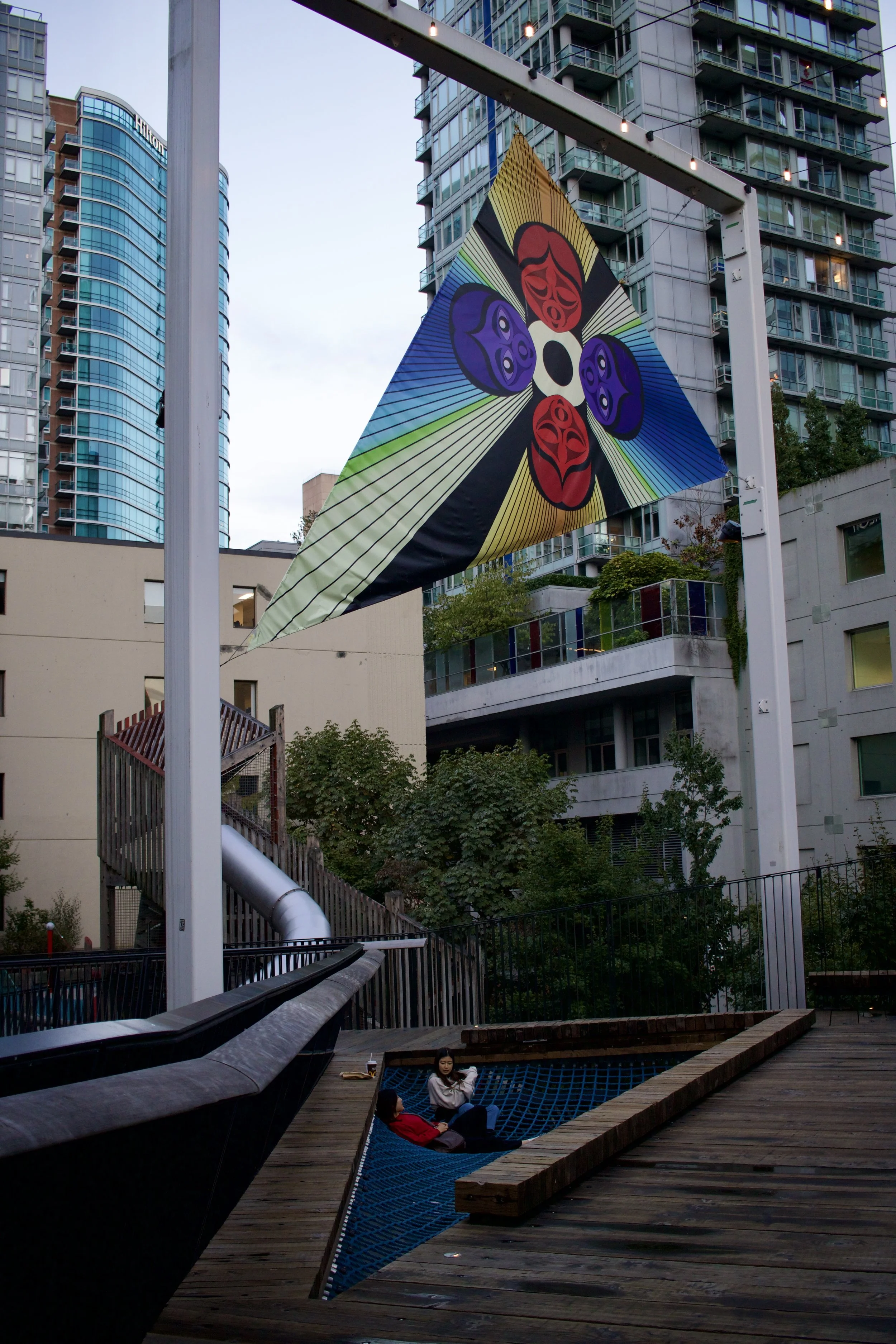 Young women enjoying rope net seating suspended over downtown’s “sθәqәlxenәm ts'exwts'áxwi7“ park (photo taken by Nicole Roach in Vancouver, British Columbia).
