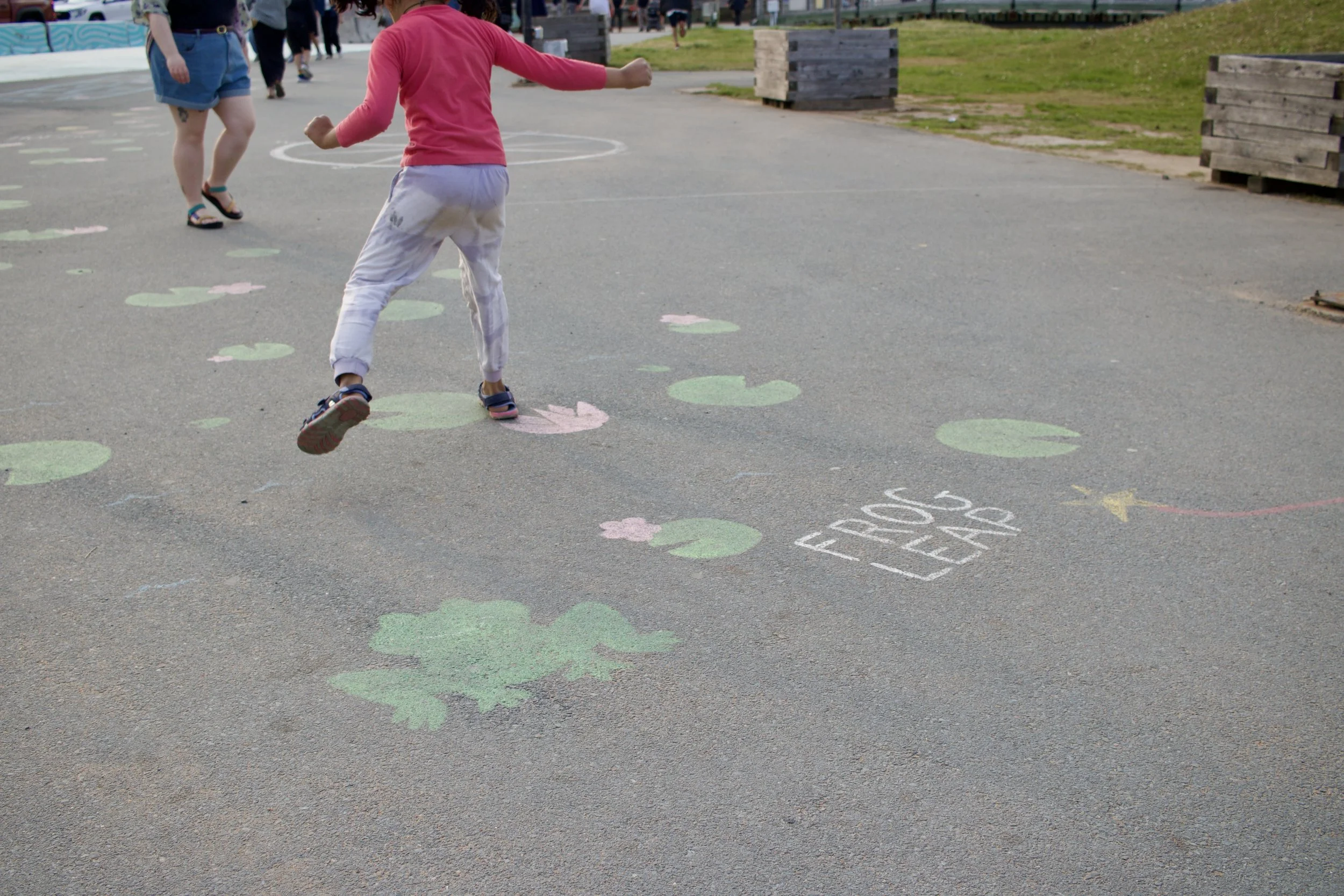 Child playing with Frog Leap interactive art along a paved path (photo taken by Nicole Roach in Halifax, Nova Scotia).