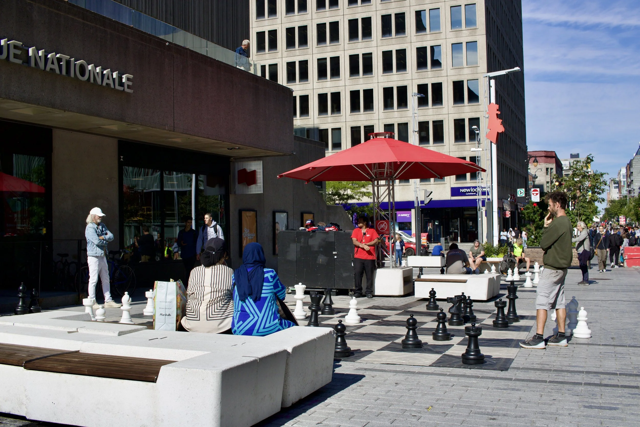 Installation featuring large-scale chess games in pedestrianized street (photo taken by Nicole Roach in Montreal, Quebec).