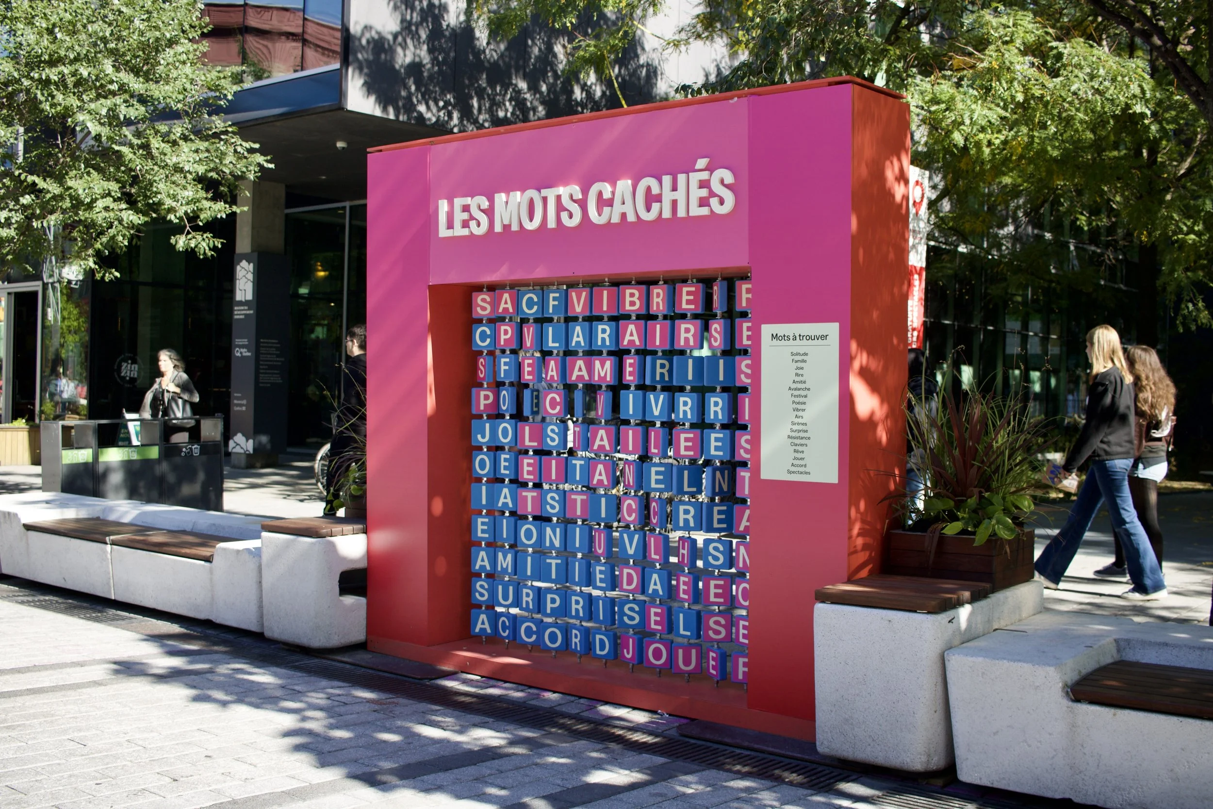 “Place Aux Jeux” installation featuring “Les Mots Cachés” word-finding game (photo taken by Nicole Roach in Montreal, Quebec).