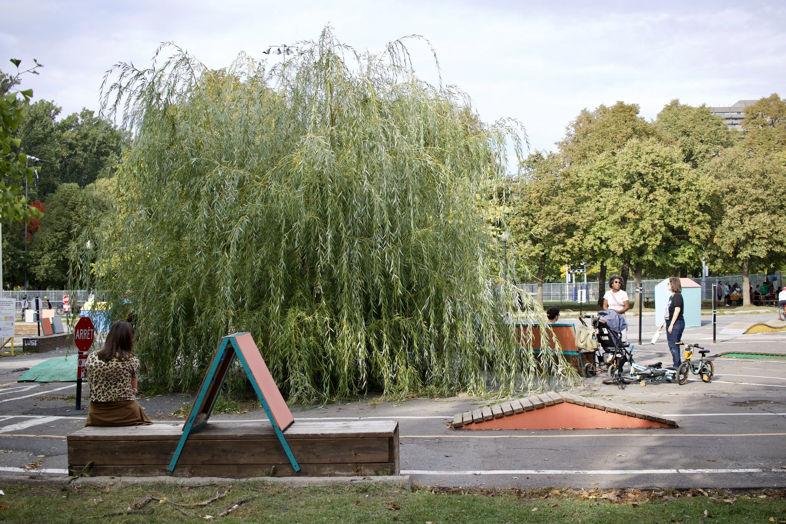 Women sitting and standing as their children explore the “Jardin du petit monde à bicyclette” educational cycling park (photo taken by Nicole Roach in Montreal, Quebec).