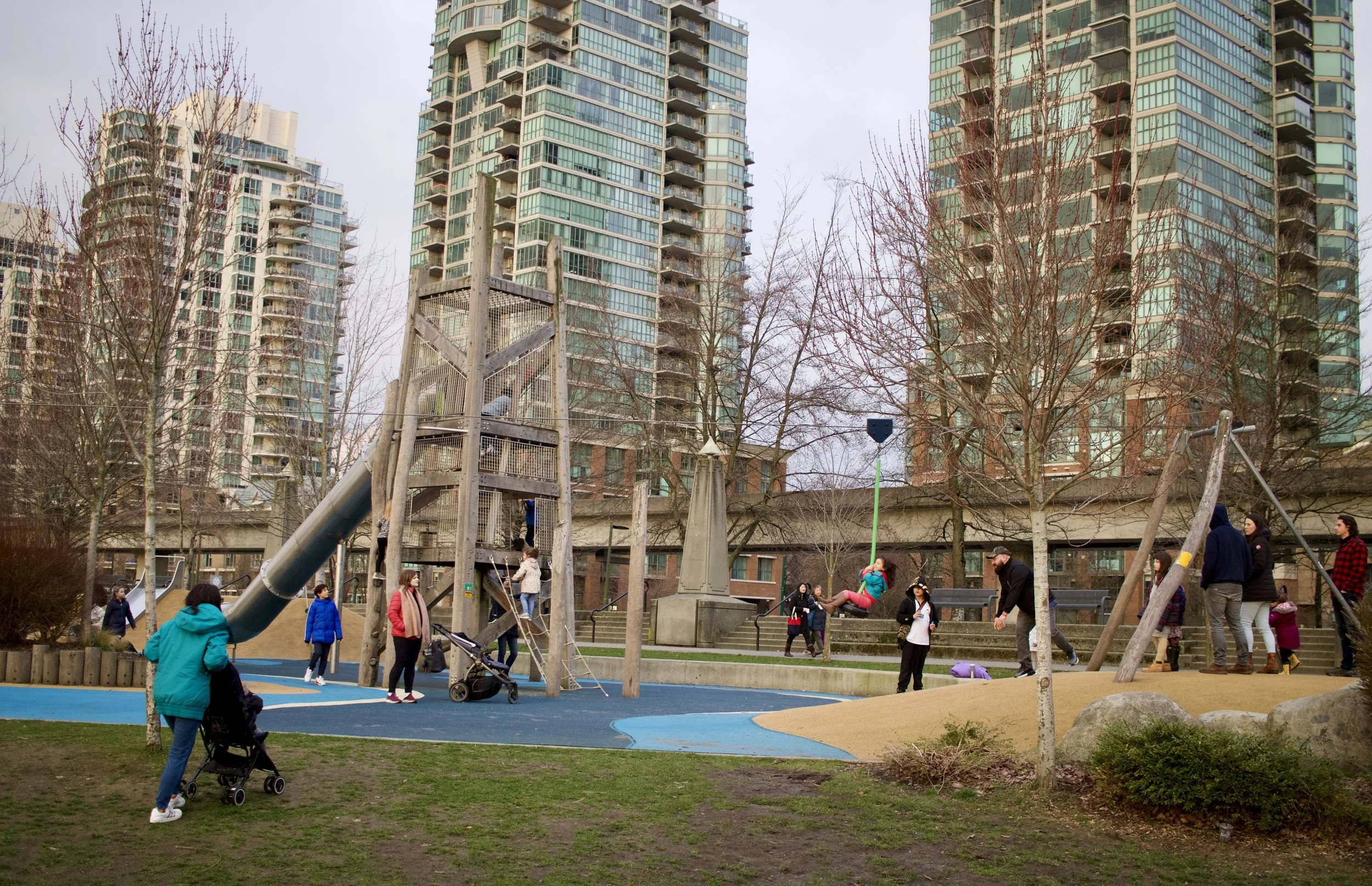 Playground in Creekside Park with climbing tower, swings, and zipline (photo taken by Nicole Roach in Vancouver, British Columbia).