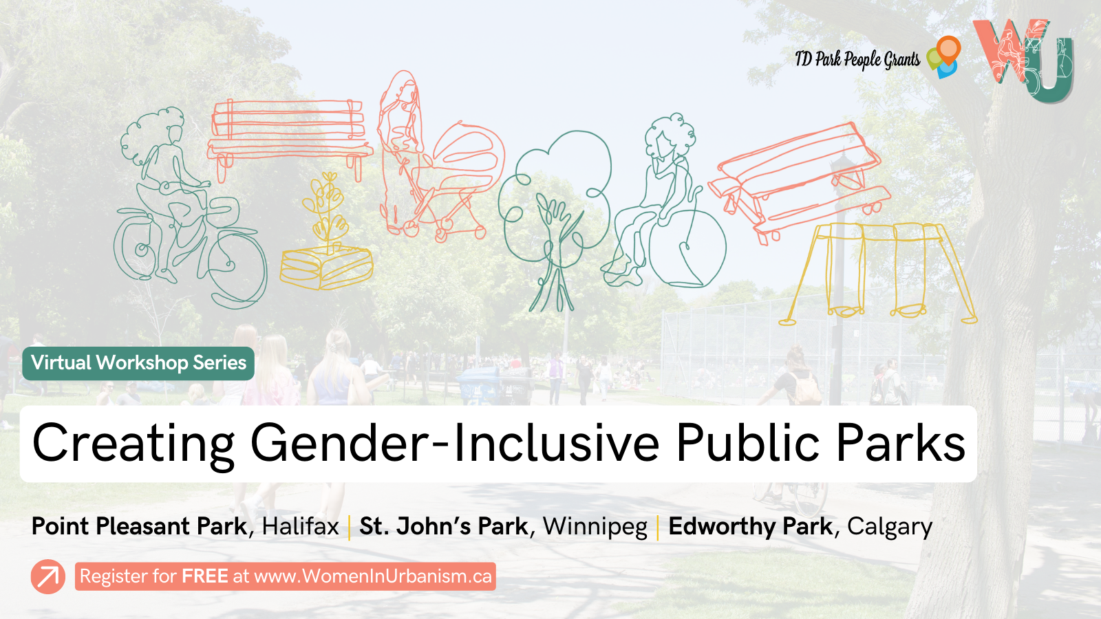 We are very excited to announce our virtual workshop series: Creating Gender Inclusive Public Parks. With funding from Park People and TD Bank, we are hosting a three-part workshop series based around themes of sustainability, inclusivity, and placemaking in public parks located in Halifax, Winnipeg, and Calgary. The objective is to raise awareness of gender inequities in public parks and engage communities in creating solutions to fit their local context.All sessions include presentations from local experts, a Q & A, and two workshop activities focused on themes of drawing connections and developing solutions. The activities include facilitated breakout sessions with discussion on: Identifying gender-based impacts on women’s ability to access and enjoy public parks; andBrainstorming which gender-based interventions can improve public parks for women and other equity-deserving genders.