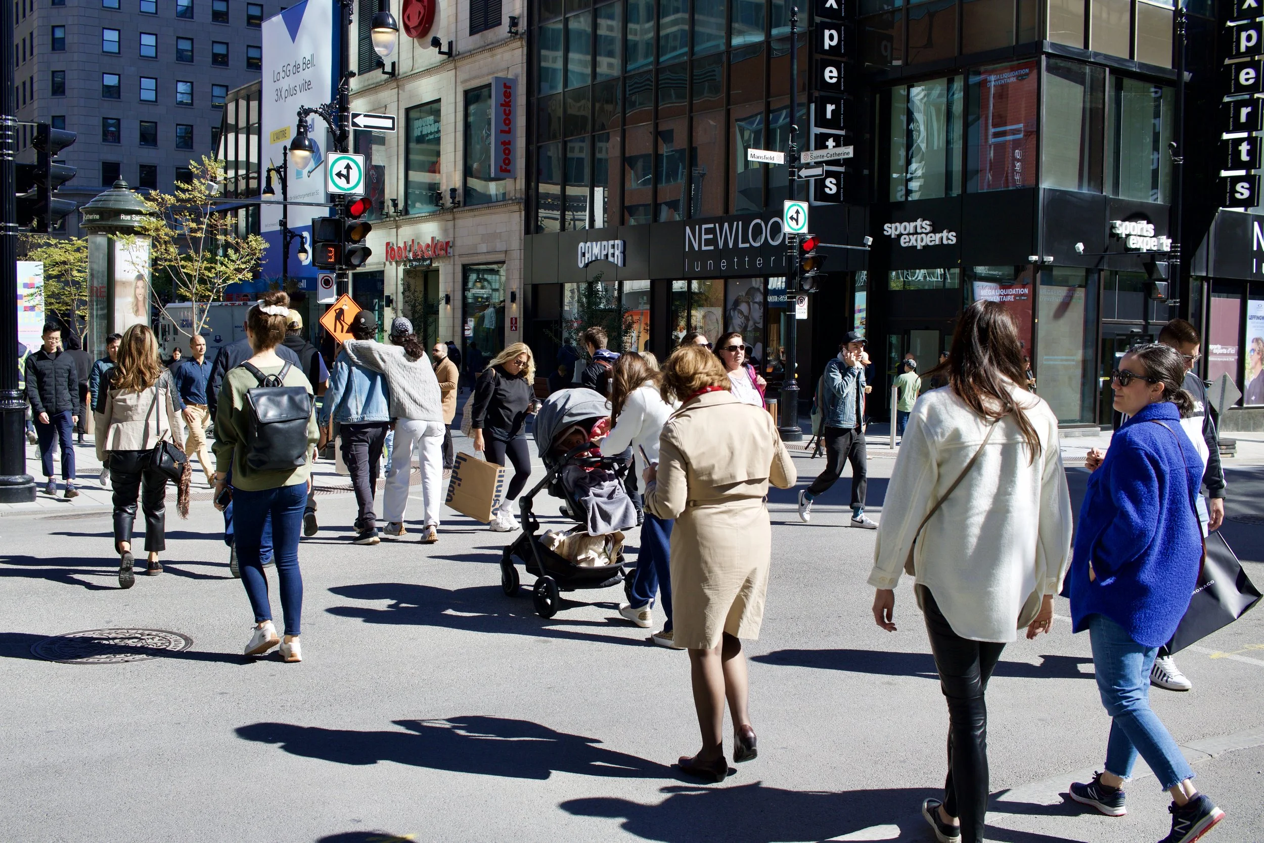 Women walking across crosswalk on St. Catherine Street, Montreal, QC (photo by: Nicole Roach, 2022)