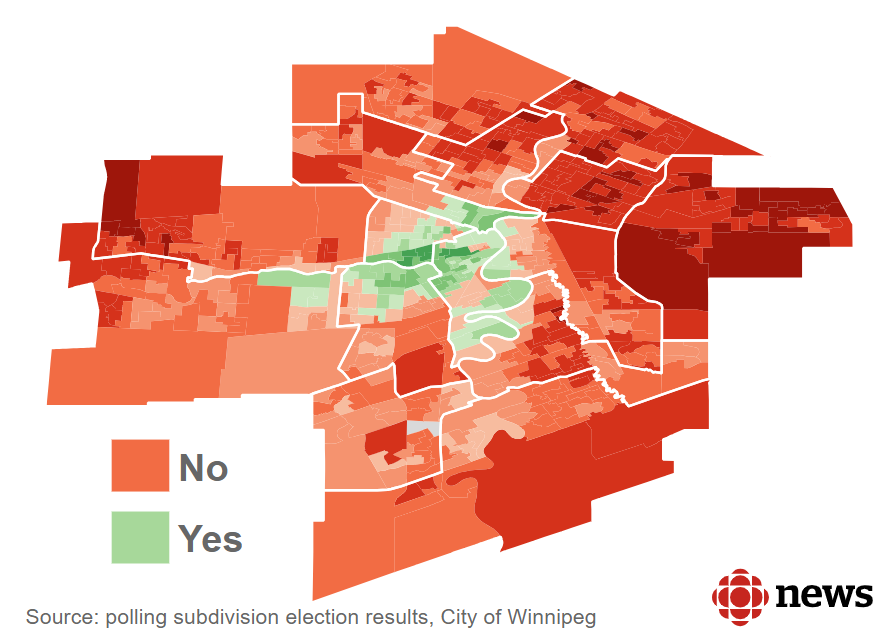65% of respondents felt that Portage and Main should remain closed to pedestrians. While the city was split between the north and the south for their mayoral candidate, the Portage and Main plebiscite showed a doughnut-shaped divide between the residents in the core neighbourhoods and those in the peripheries. Those who voted ‘No’ tended to live further from the city centre, and would likely be interacting with Portage and Main in a vehicle. Polling election results for the Portage and Main ballot question, 65% of the popular vote stated “no” the intersection should not be reopened to pedestrians. Source: CBC News