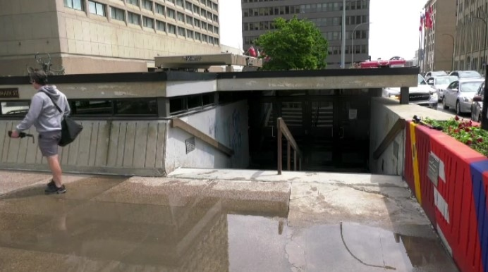 Many public access points are located in private buildings that are closed outside of business hours, so if a pedestrian chooses to enter the underground concourse, they often have to do so by entering a dark stairwell that lacks sight-lines to nearby streets. As more commuters descend into the underground concourse, there are fewer ‘eyes on the street,’ making what should be the most lively corner in Winnipeg feel desolate. For women who face significantly greater street harassment than men, the lack of eyes on the street is of concern. 33% of Canadian women have experienced unwanted sexual behaviour in public spaces. With fewer people around there is little accountability, and can make a space feel unwelcoming, severely limiting evening and weekend mobility for women living and visiting Portage and Main.Stairwell and bunker at Portage and Main. Source: CTV News Winnipeg