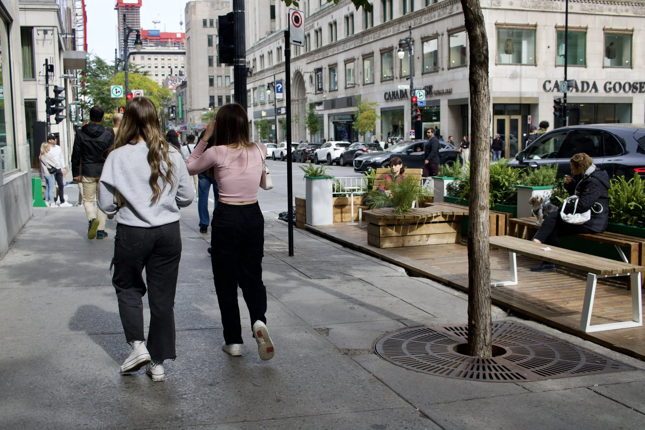 Two women walking along Saint-Catherine Street in Montreal, QC beside a parklet with additional women sitting (photo by Nicole Roach 2022)