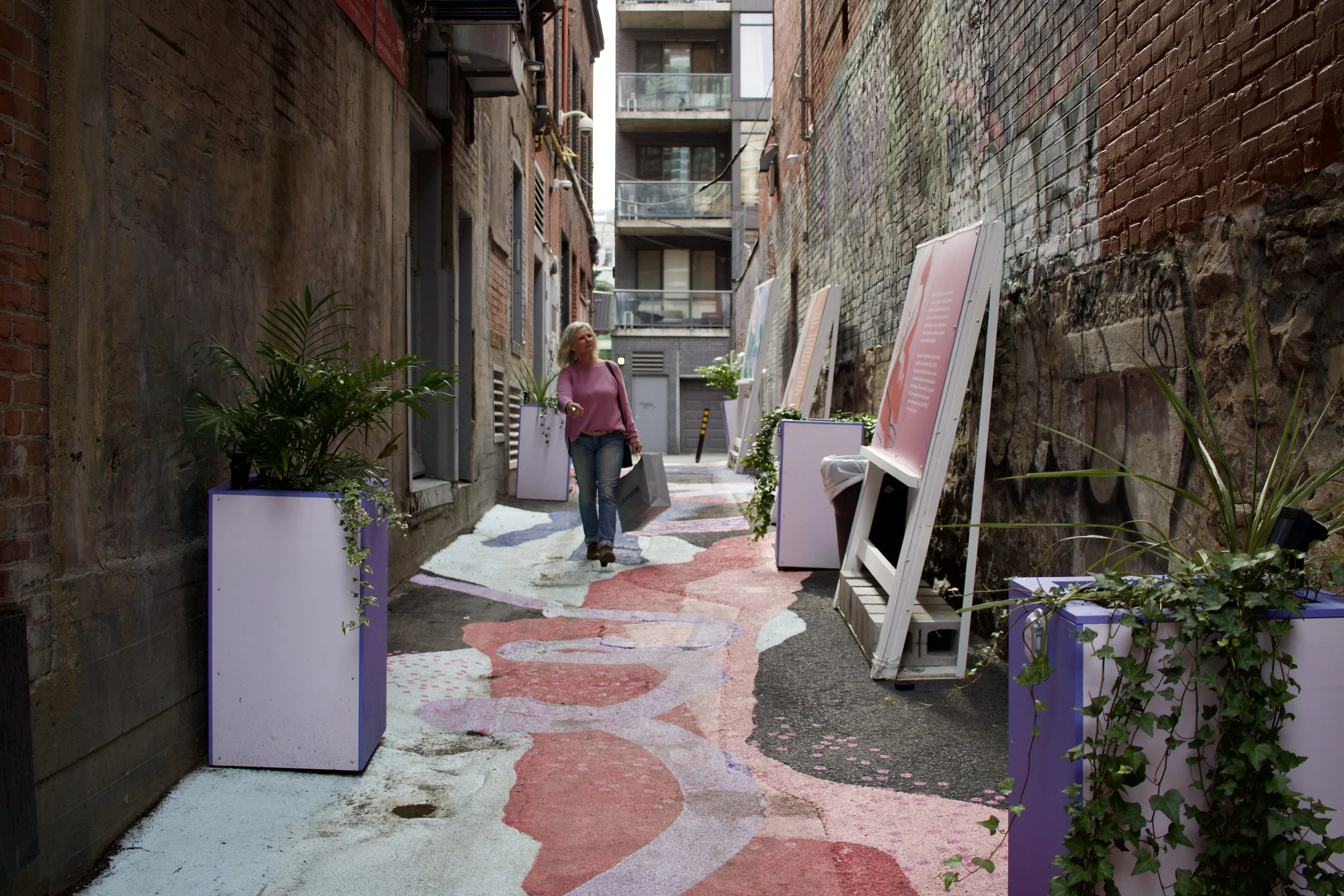 Woman walking down alleyway that has been enhanced with public art, plants, and signage in Ruelle Stanley in Montreal, QC (Photo by Nicole Roach, 2022)