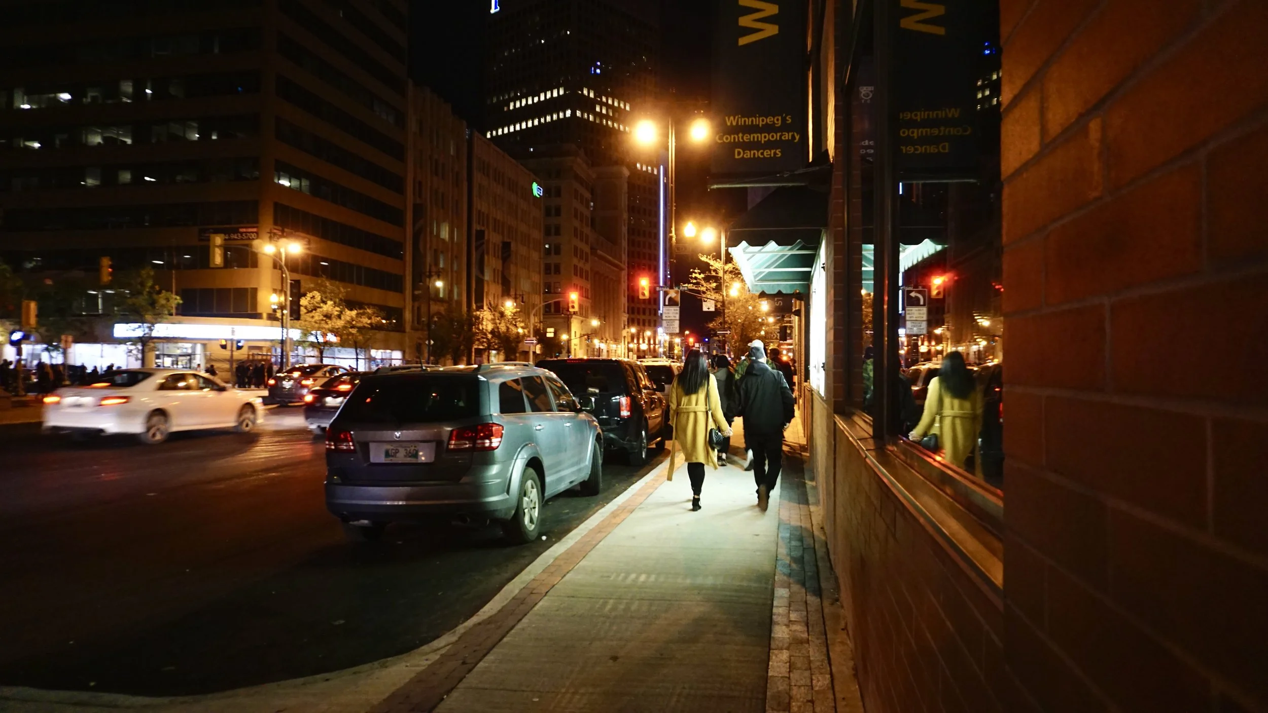 Couple walking on narrow sidewalk in downtown Winnipeg, MB (Photo by Nicole Roach 2019)