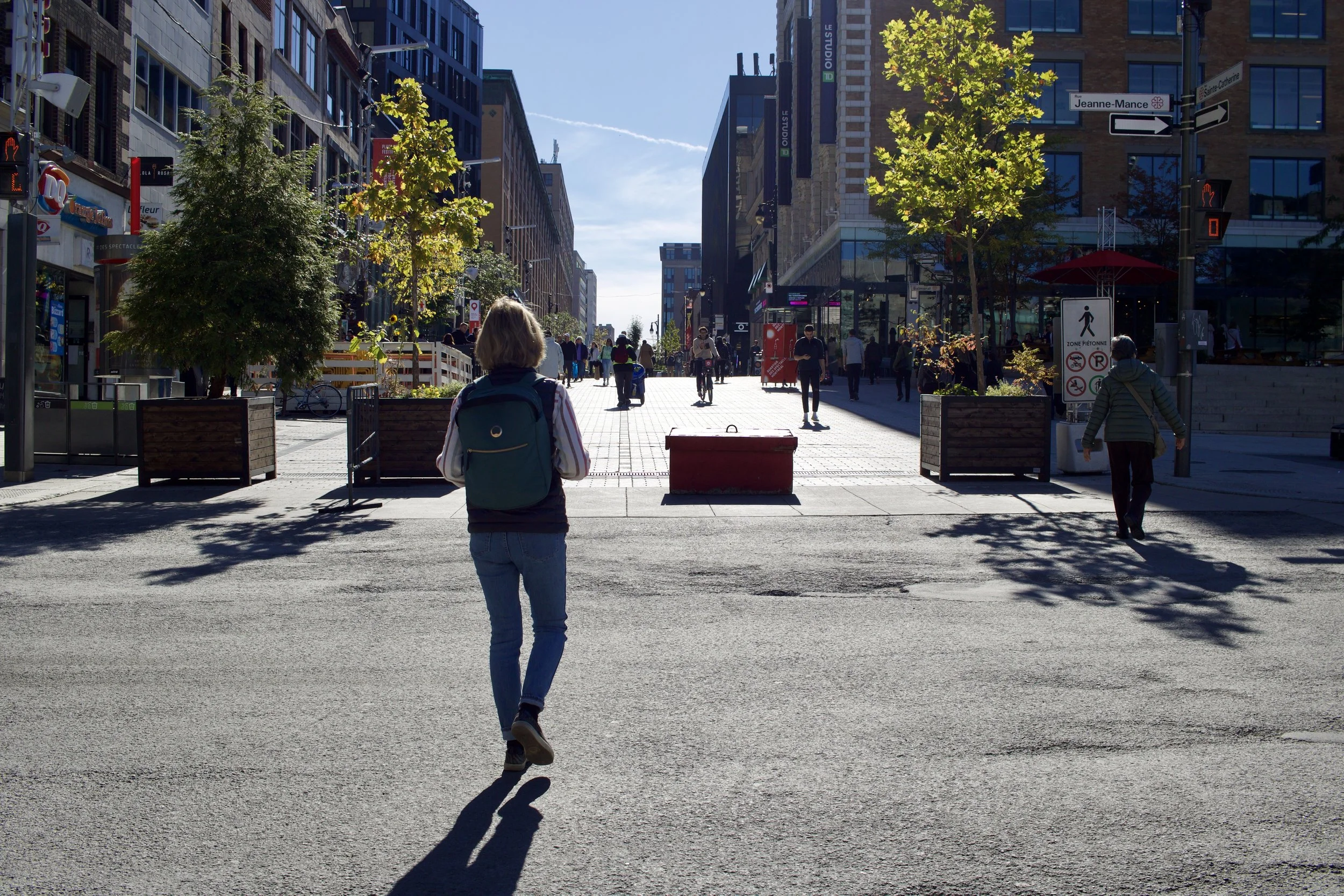 Woman walking towards car-free zone on Saint-Catherine Street in Montreal, QC (Photo by Nicole Roach)