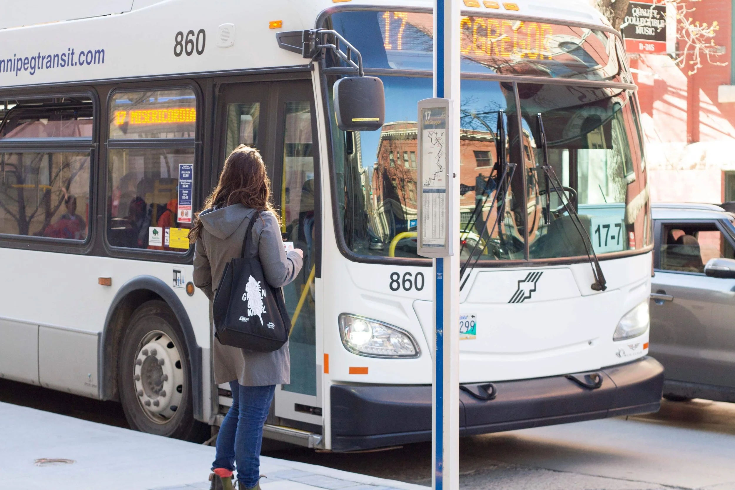 Photo of Nicole boarding a Winnipeg Transit bus. Photographed by Bethany Daman.