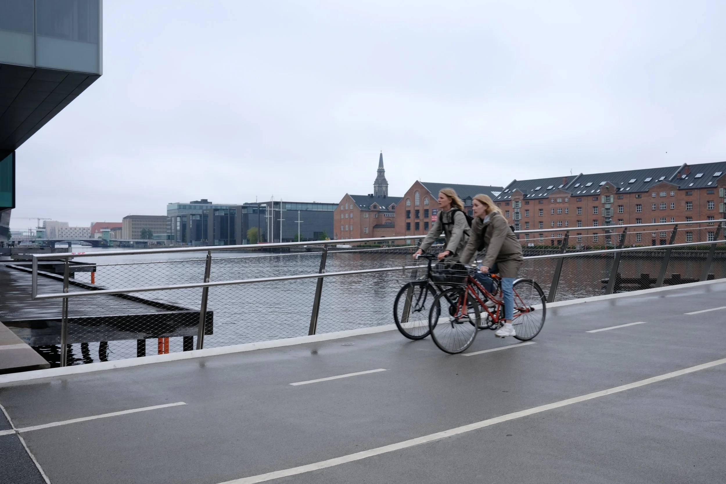 Two teen girls biking over a shared active transportation bridge in Copenhagen, 2022. (Photographed by Sharee Hochman).