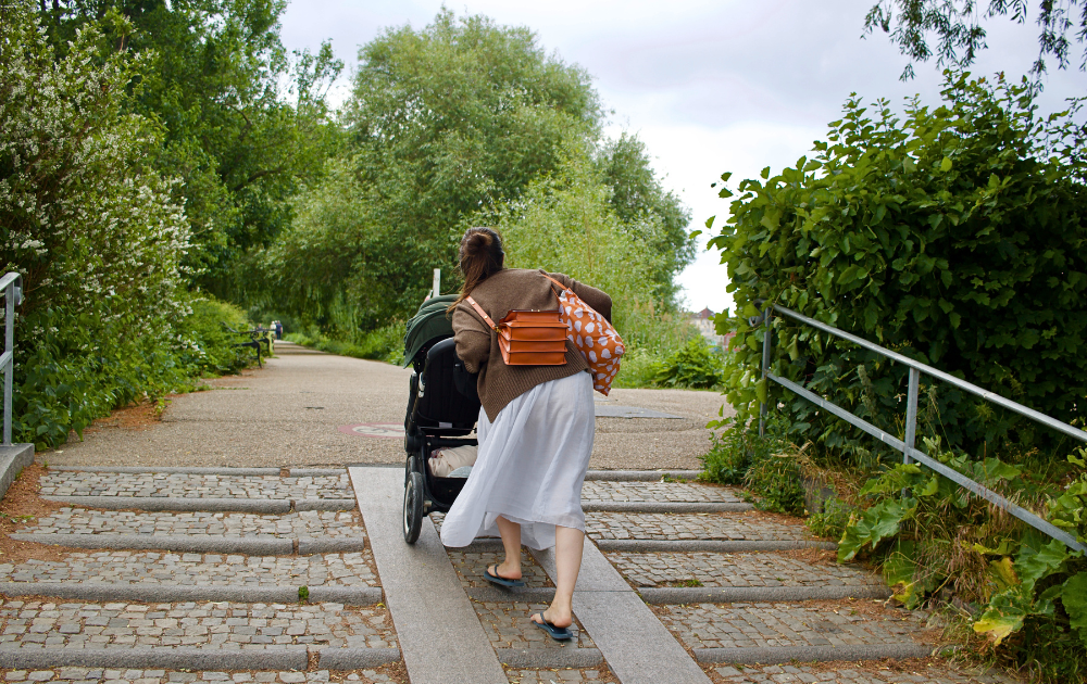 A woman pushes a stroller up a steep hill in Copenhagen, DK. Photo taken by Nicole Roach.