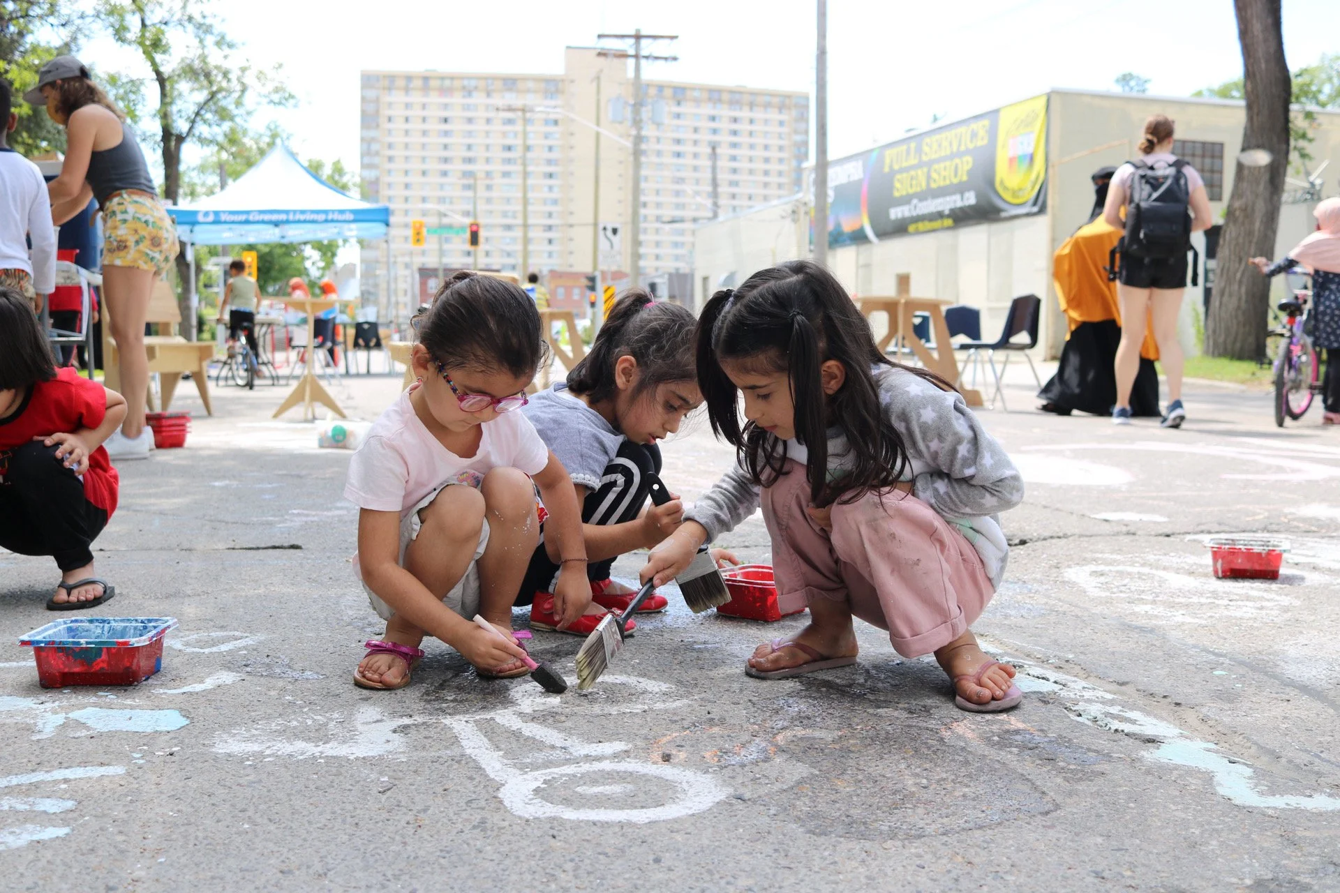 Children playing together at the Love30on30 community street safety event in Winnipeg, MB 2020. Photo taken by Nicole Roach on behalf of Green Action Centre.