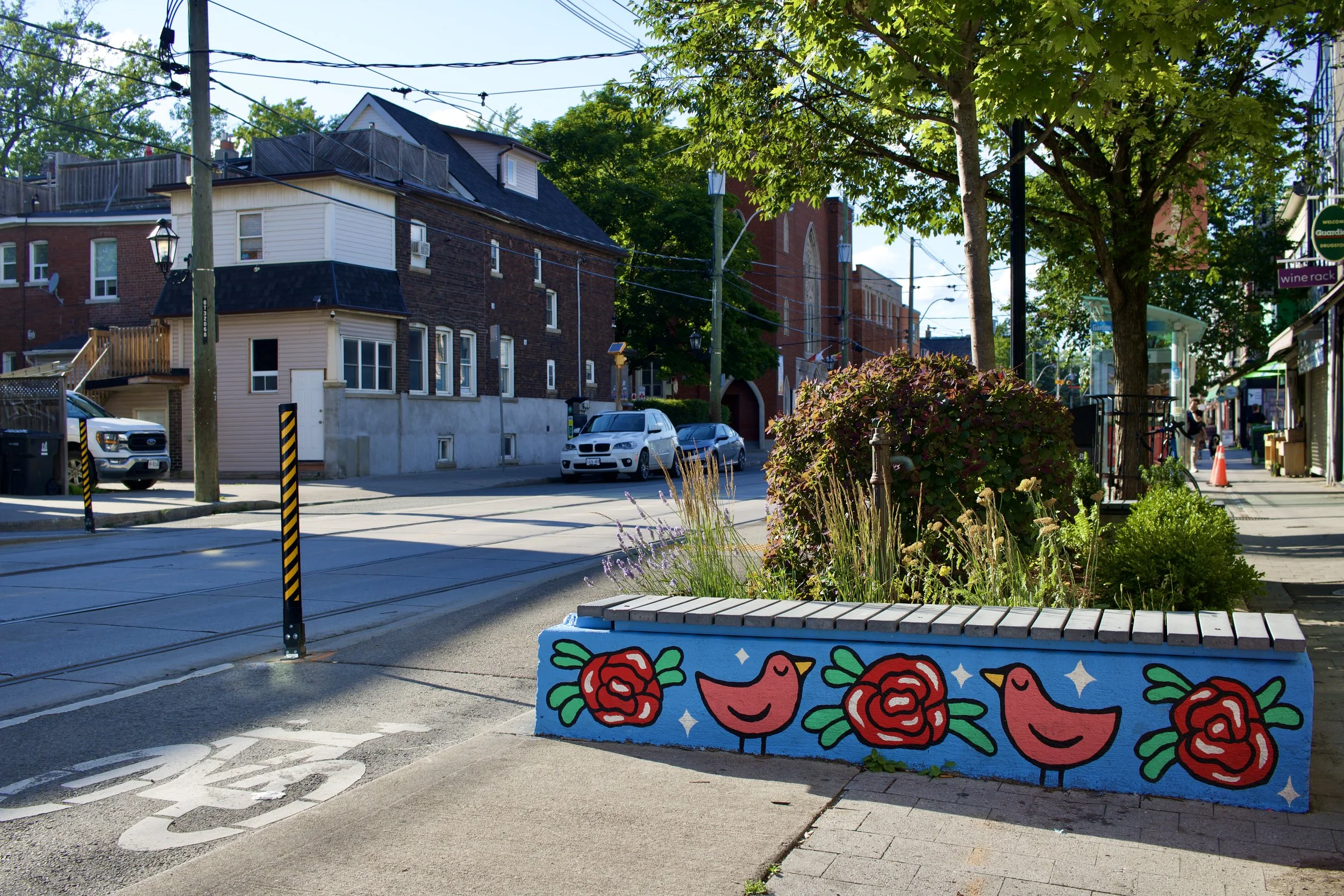 Bench seating with artwork next to a garden (Roncesvalles, Toronto, ON, taken by Nicole Roach).