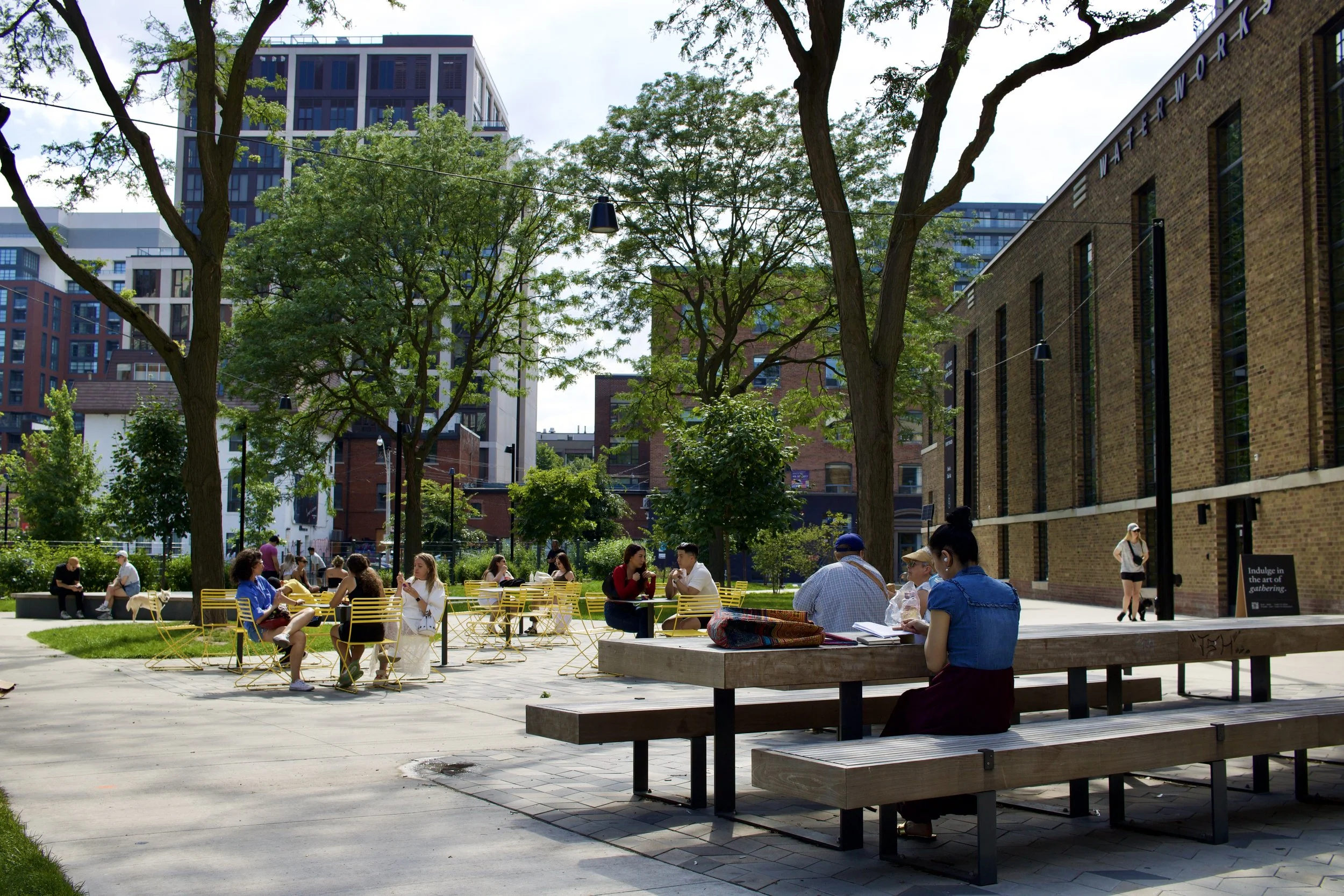 Lots of seating in a park including a platform, tables and chairs, and large picnic tables (Toronto, ON, taken by Nicole Roach).