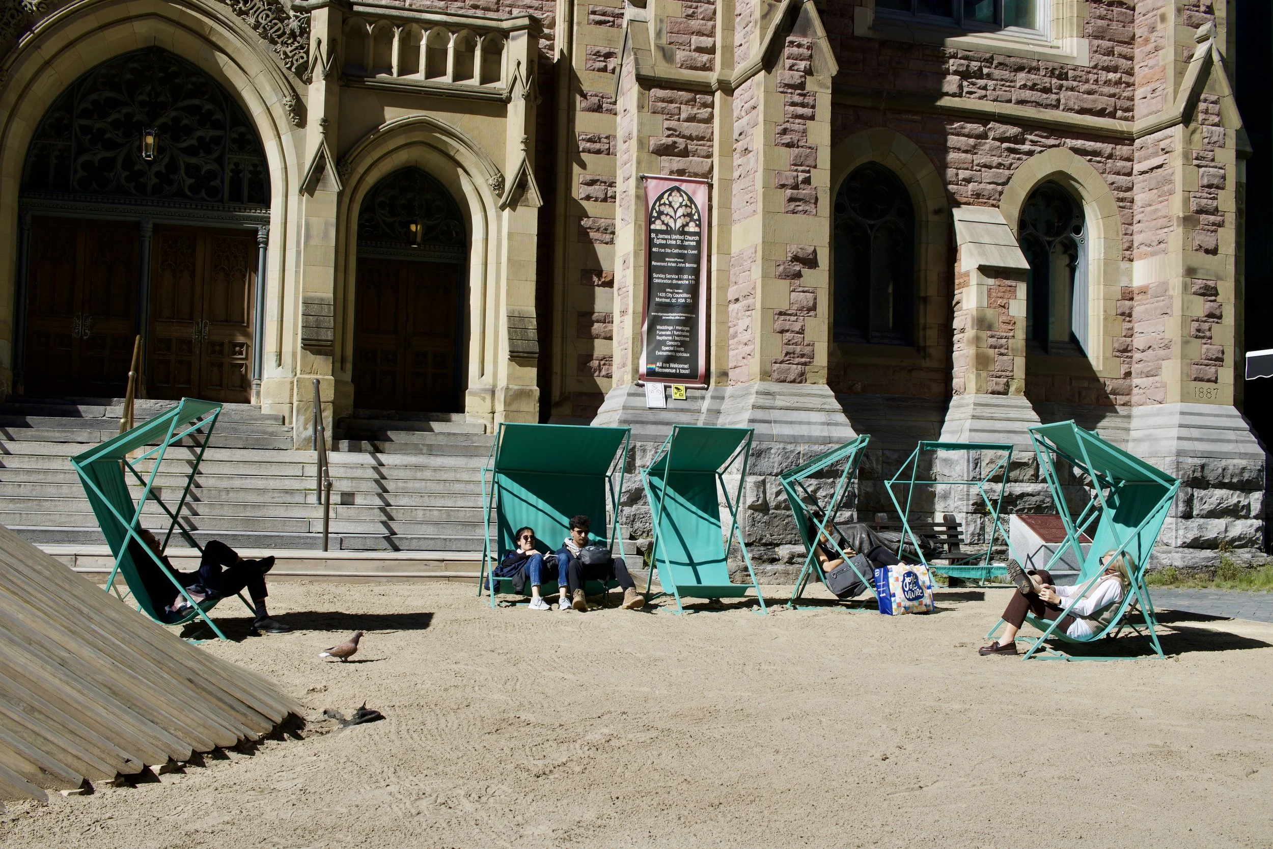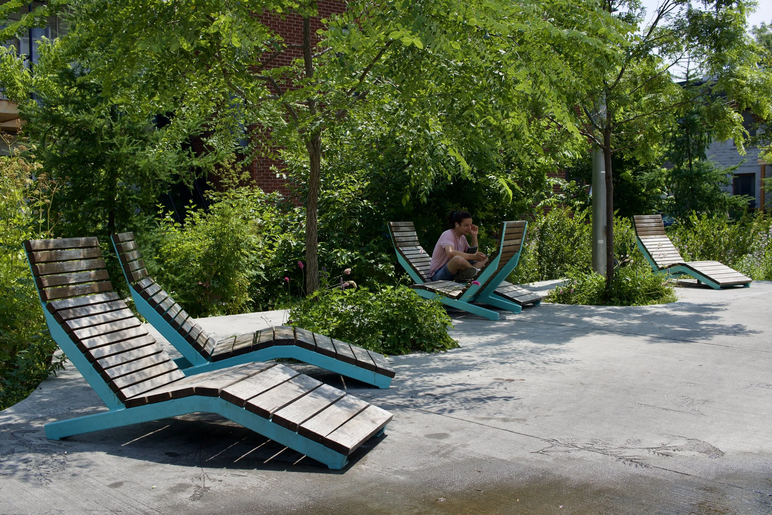 Reclined lounge seating in a pocket park (Montréal, QC, taken by Nicole Roach).