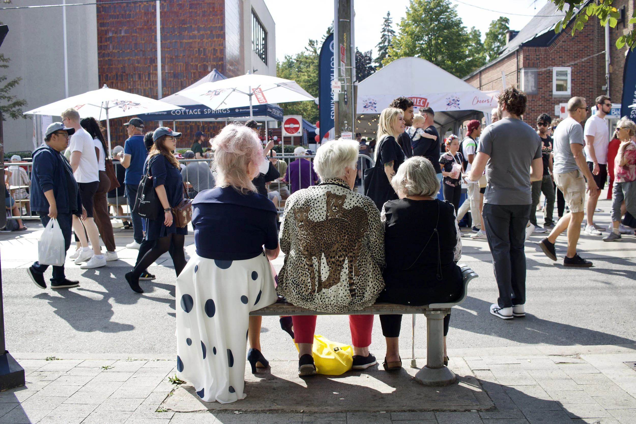 Women sitting on a bench during an open-street festival (Roncesvalles, Toronto, ON, taken by Nicole Roach).