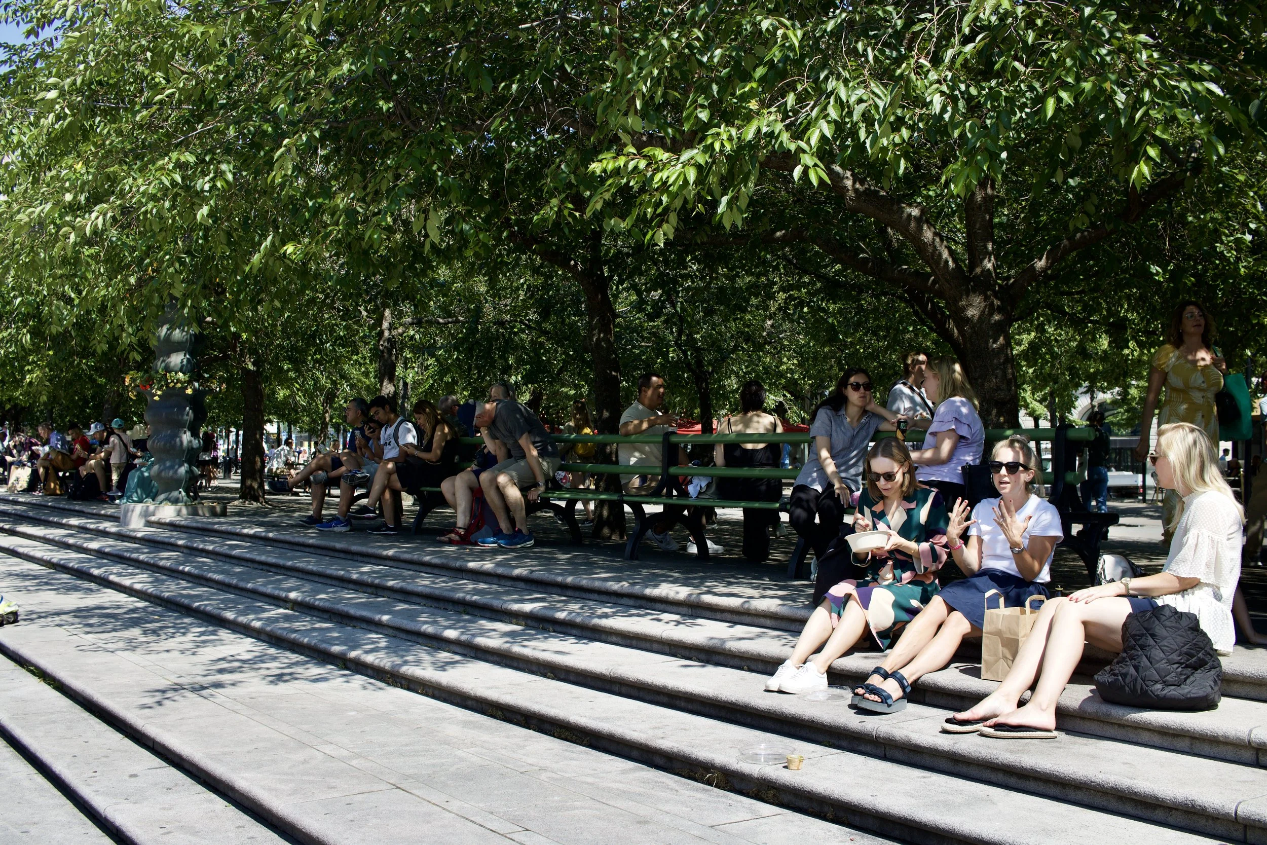 Picnic benches sheltered by trees in public plaza (Stockholm, Sweden, taken by Nicole Roach).