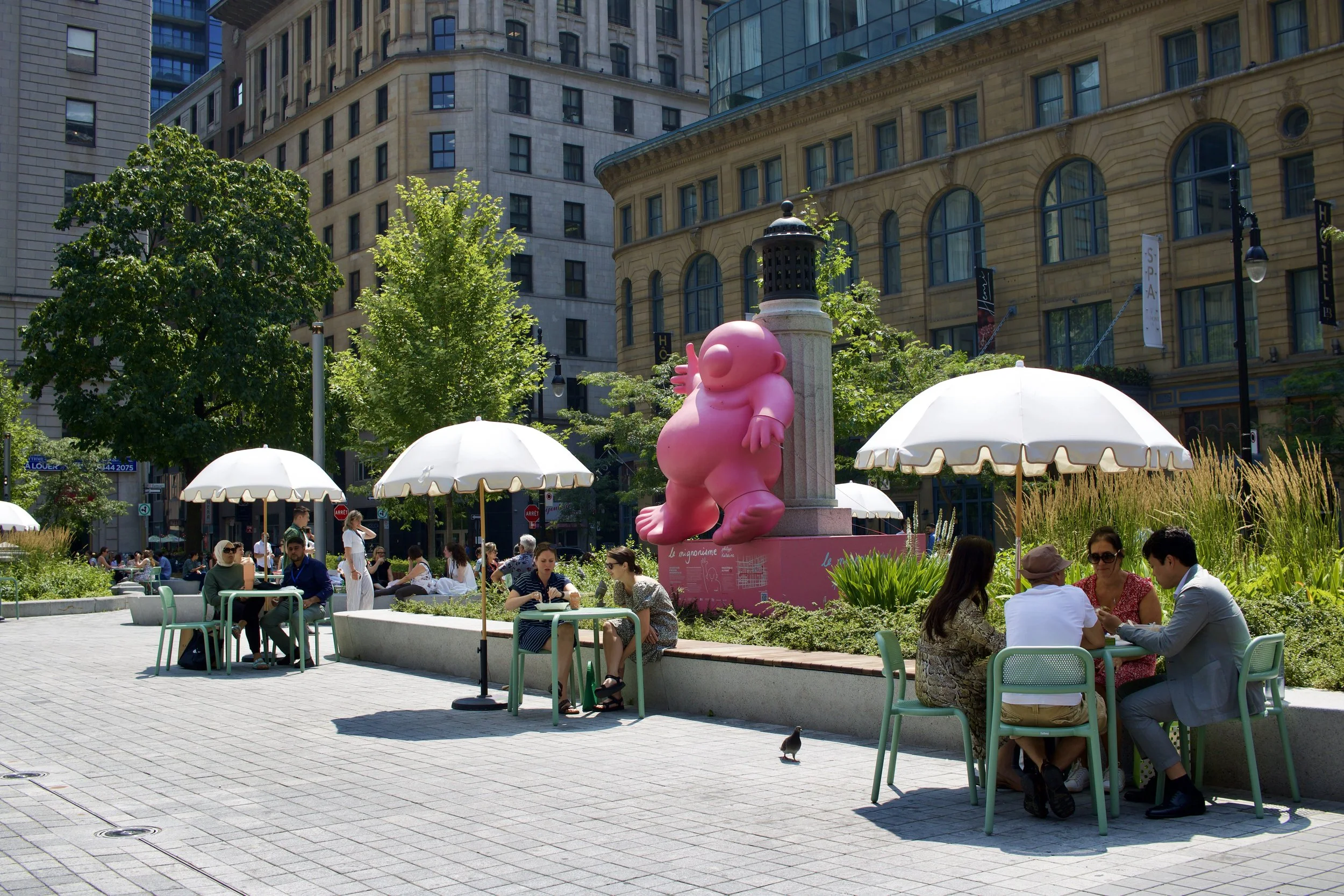 Tables and chairs with umbrellas in a pocket park (Montréal, QC, taken by Nicole Roach).