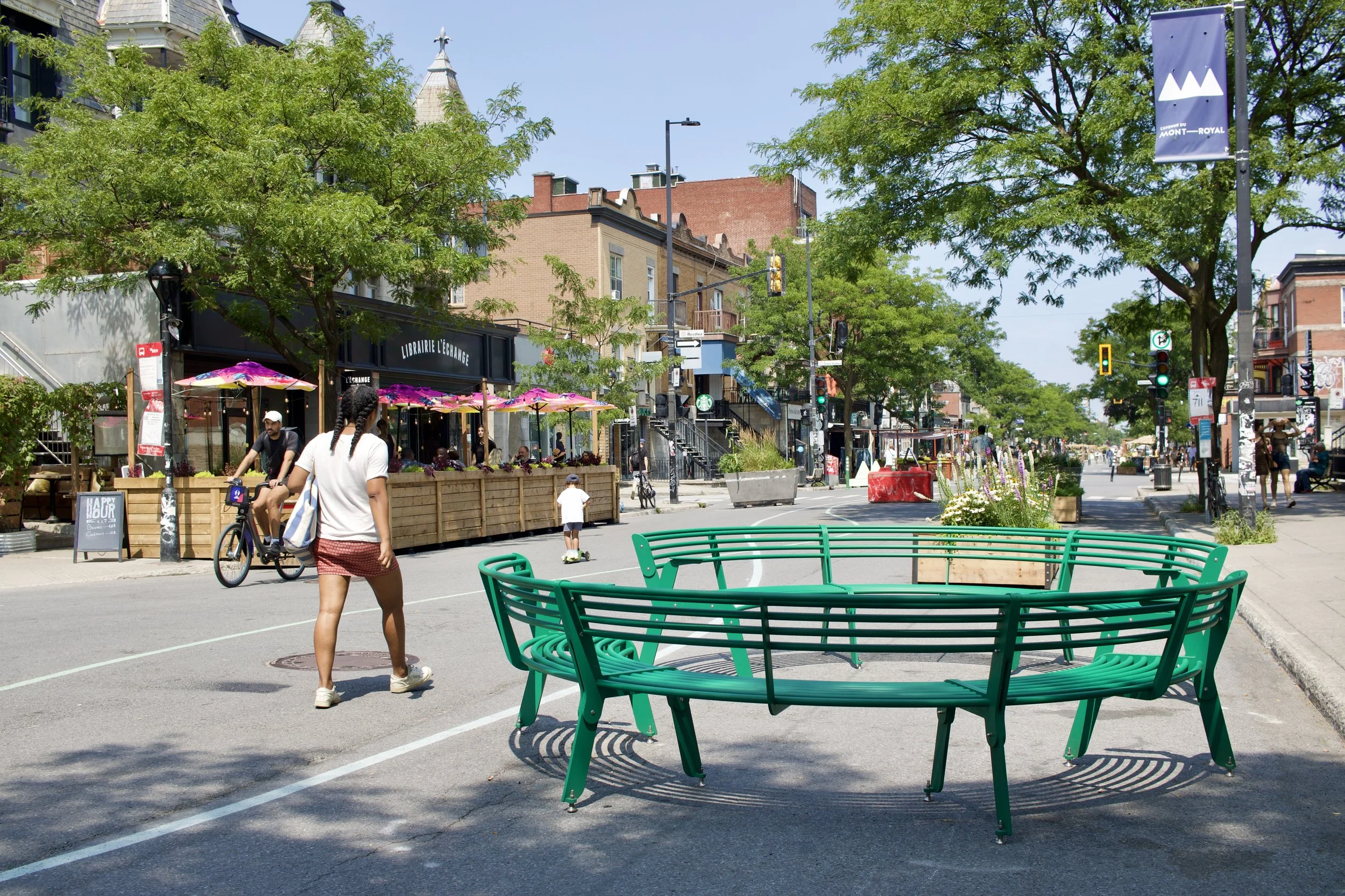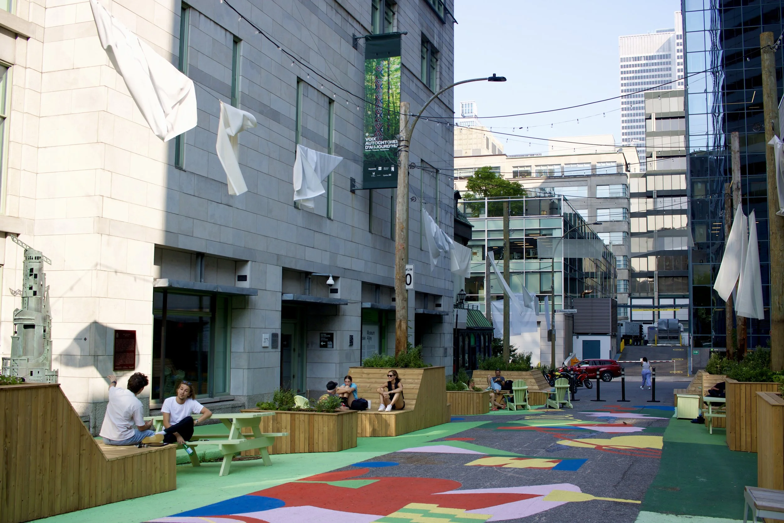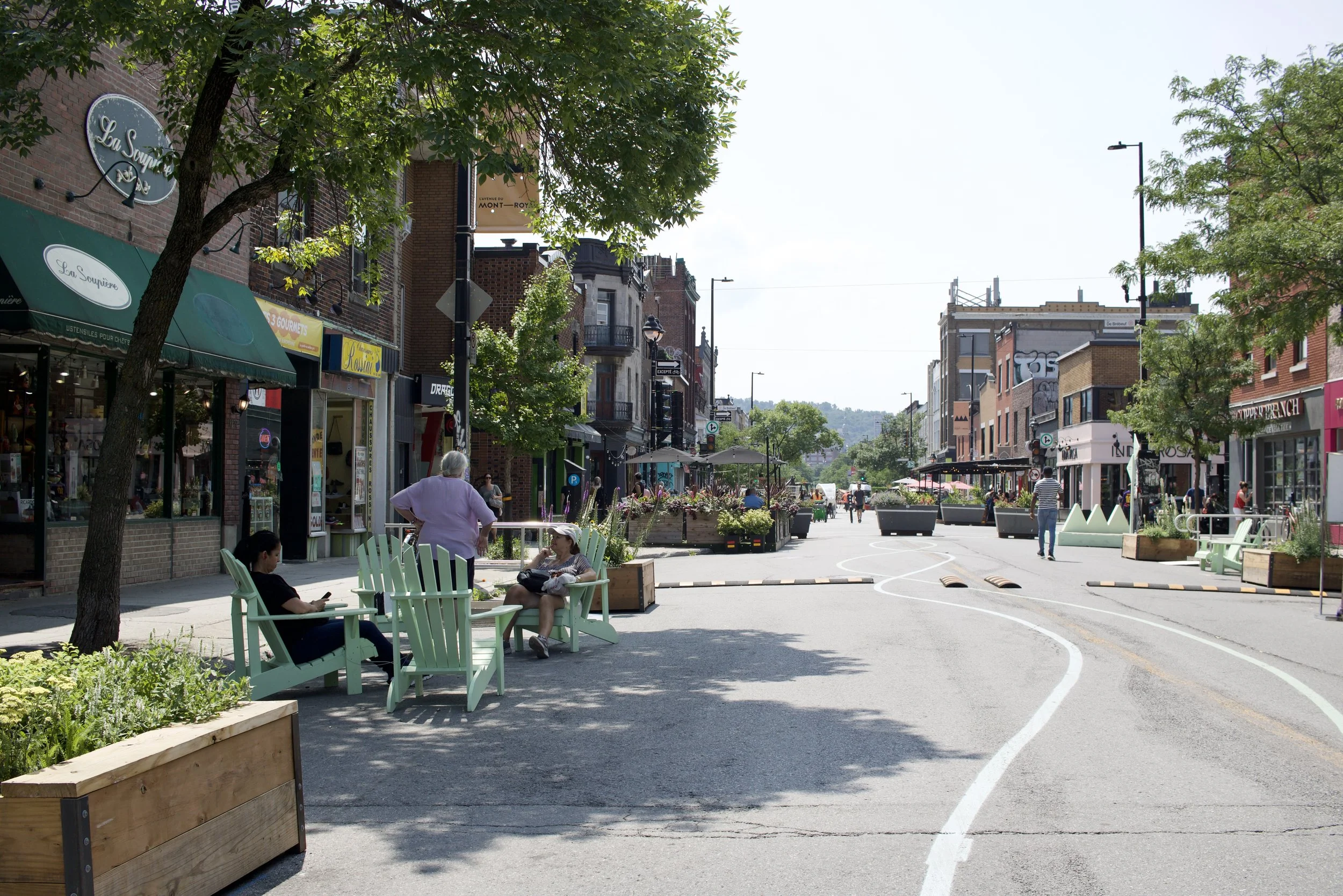 Open street/pocket parkette with benches, planters, platforms, picnic tables, and lounger chairs (Montréal, QC, taken by Nicole Roach).
