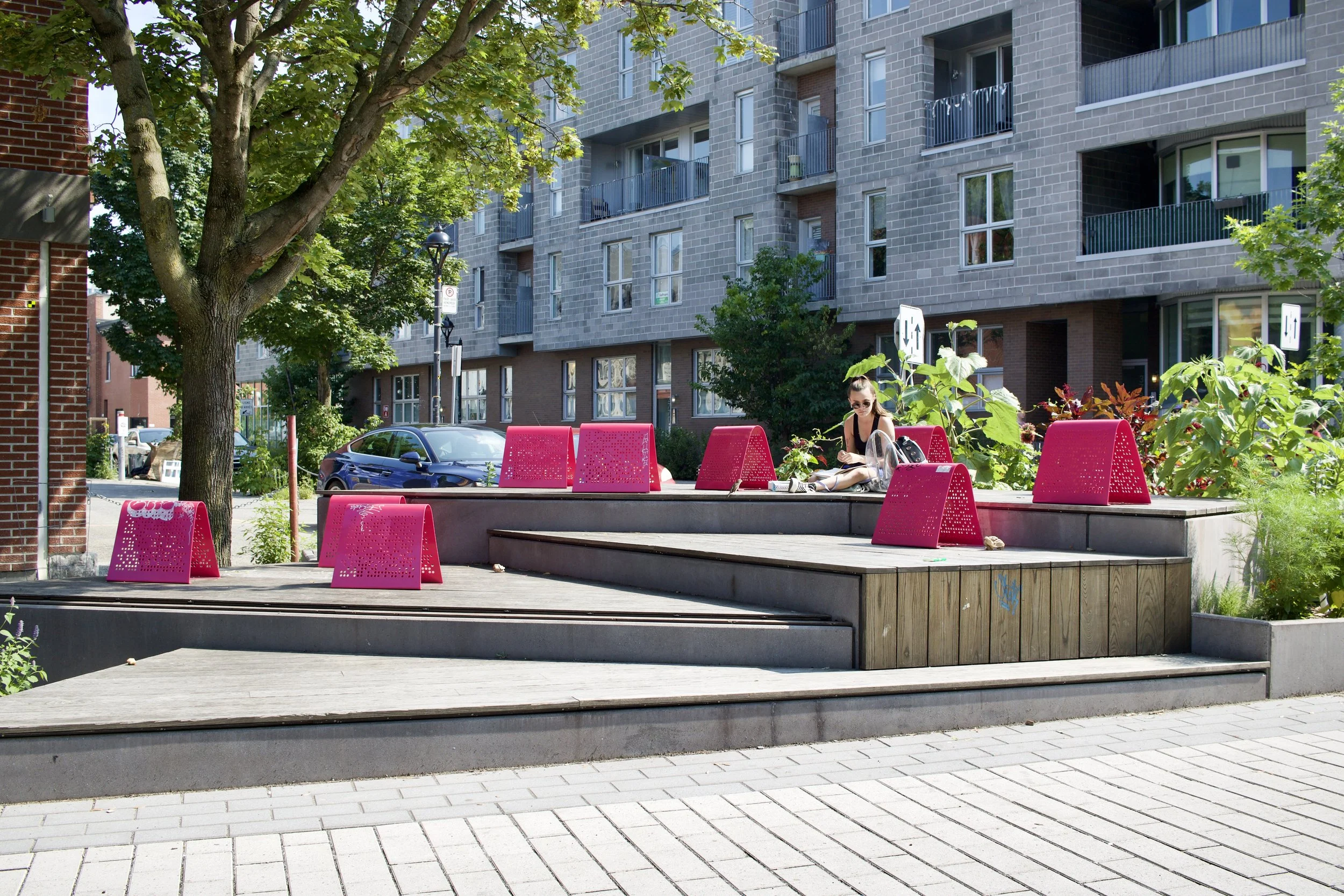 Multi-level seating platforms with pink backrests in pocket park (Montréal, QC, taken by Nicole Roach).