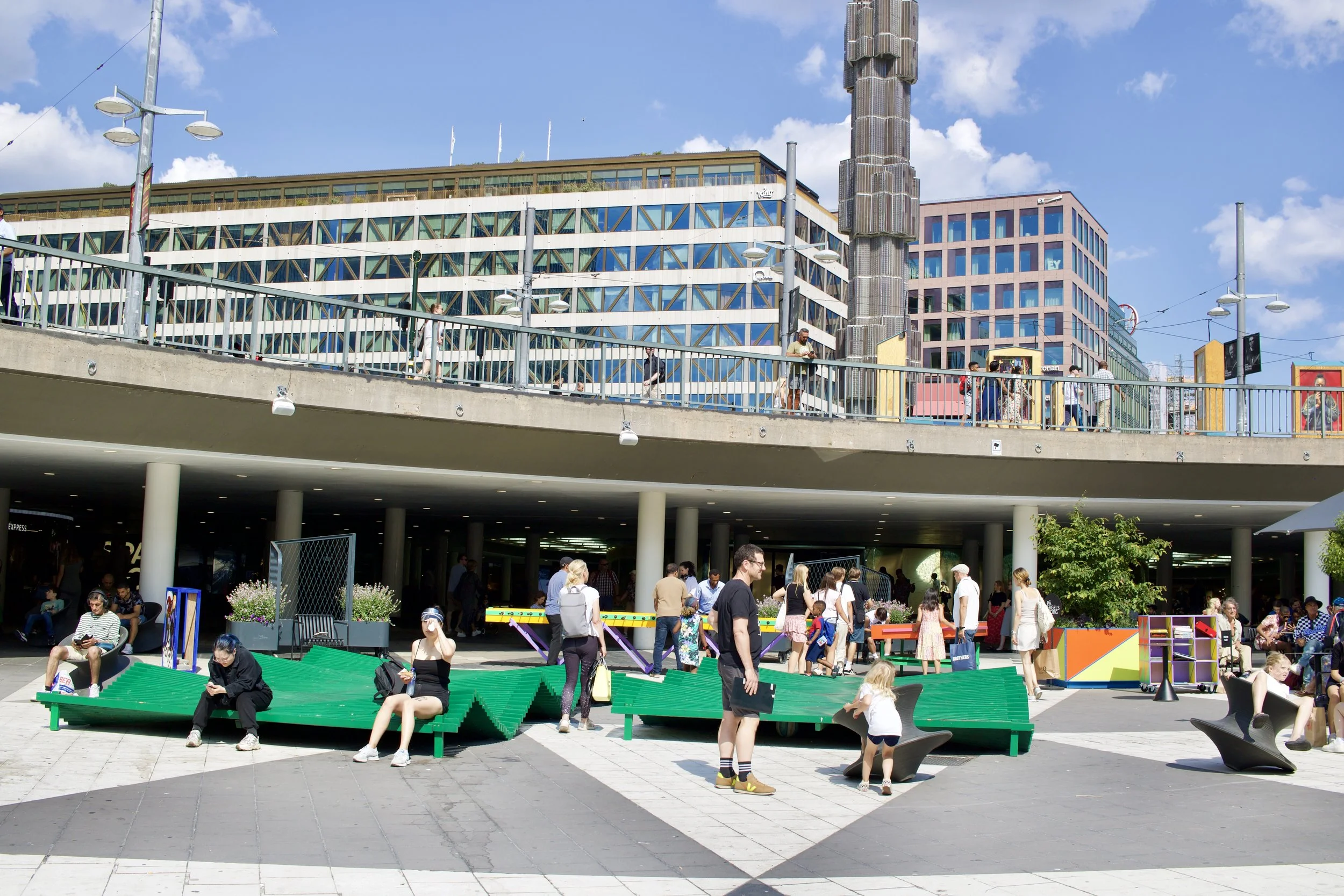 Rolling chairs and games alongside wavy benches in public plaza (Stockholm, Sweden, taken by Nicole Roach).