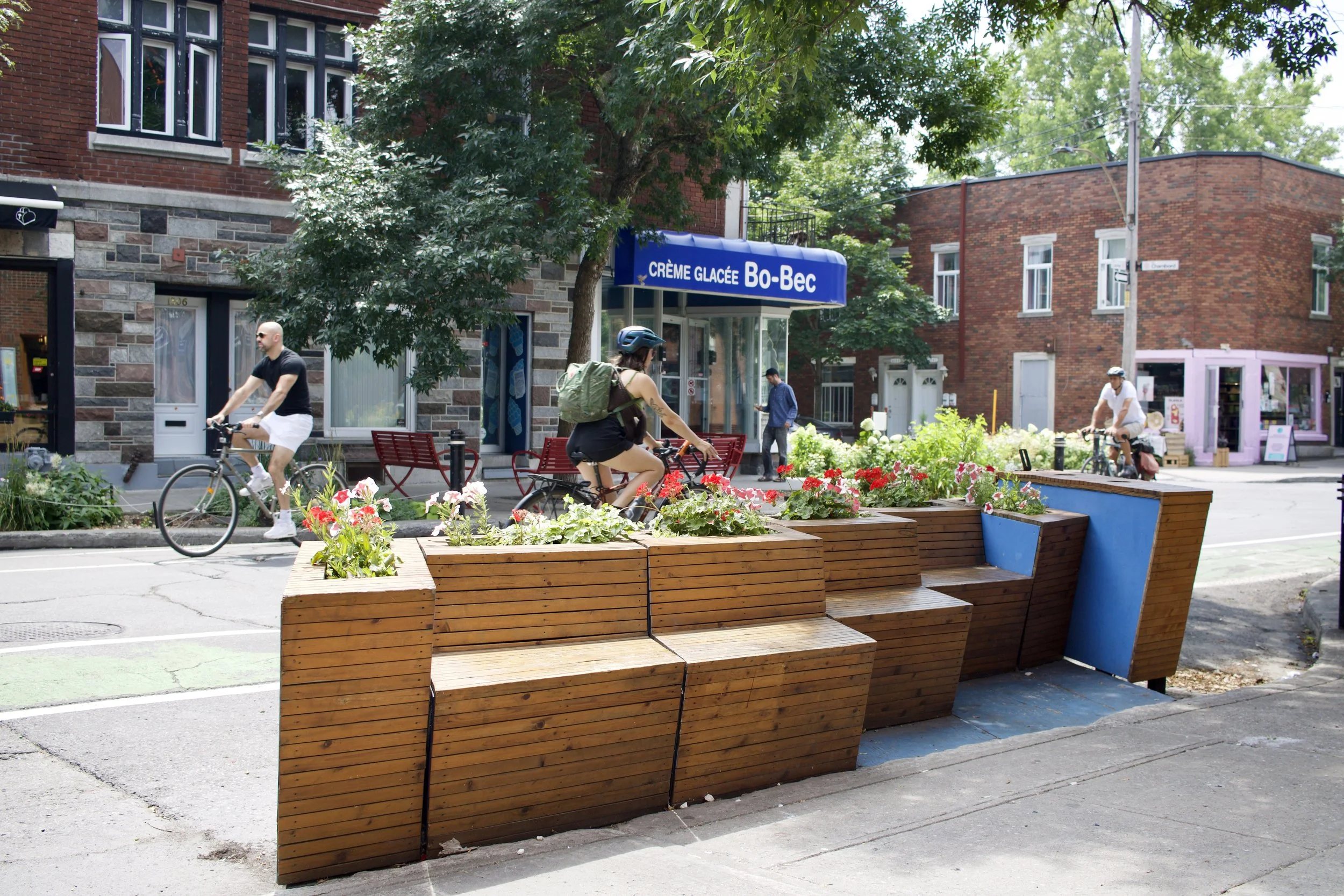 On-street parkette with seats, tables, and flowerbeds (Montréal, QC, taken by Nicole Roach).