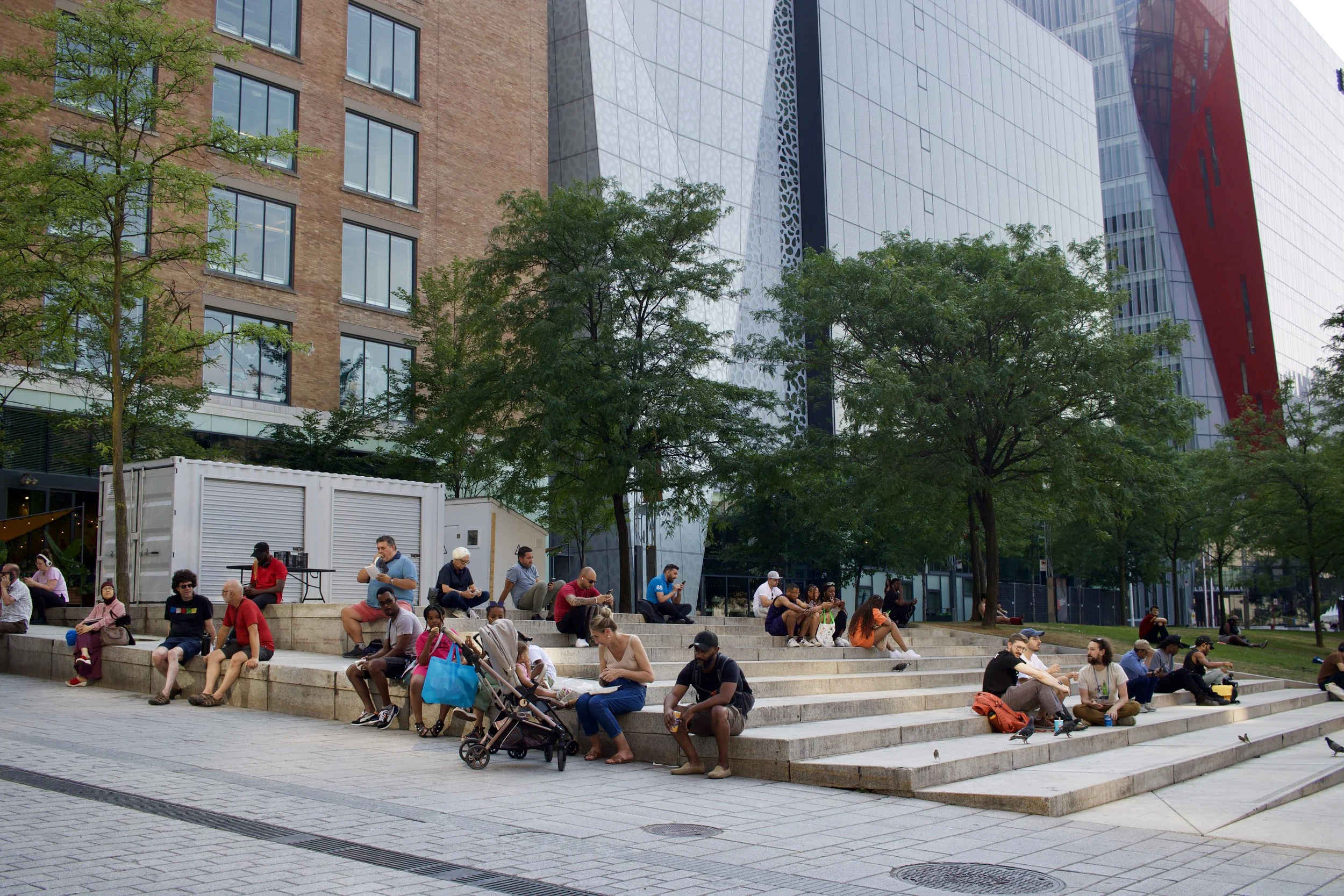 People sitting on platforms, steps, and grass alongside an open-street (Montréal, QC, taken by Nicole Roach).