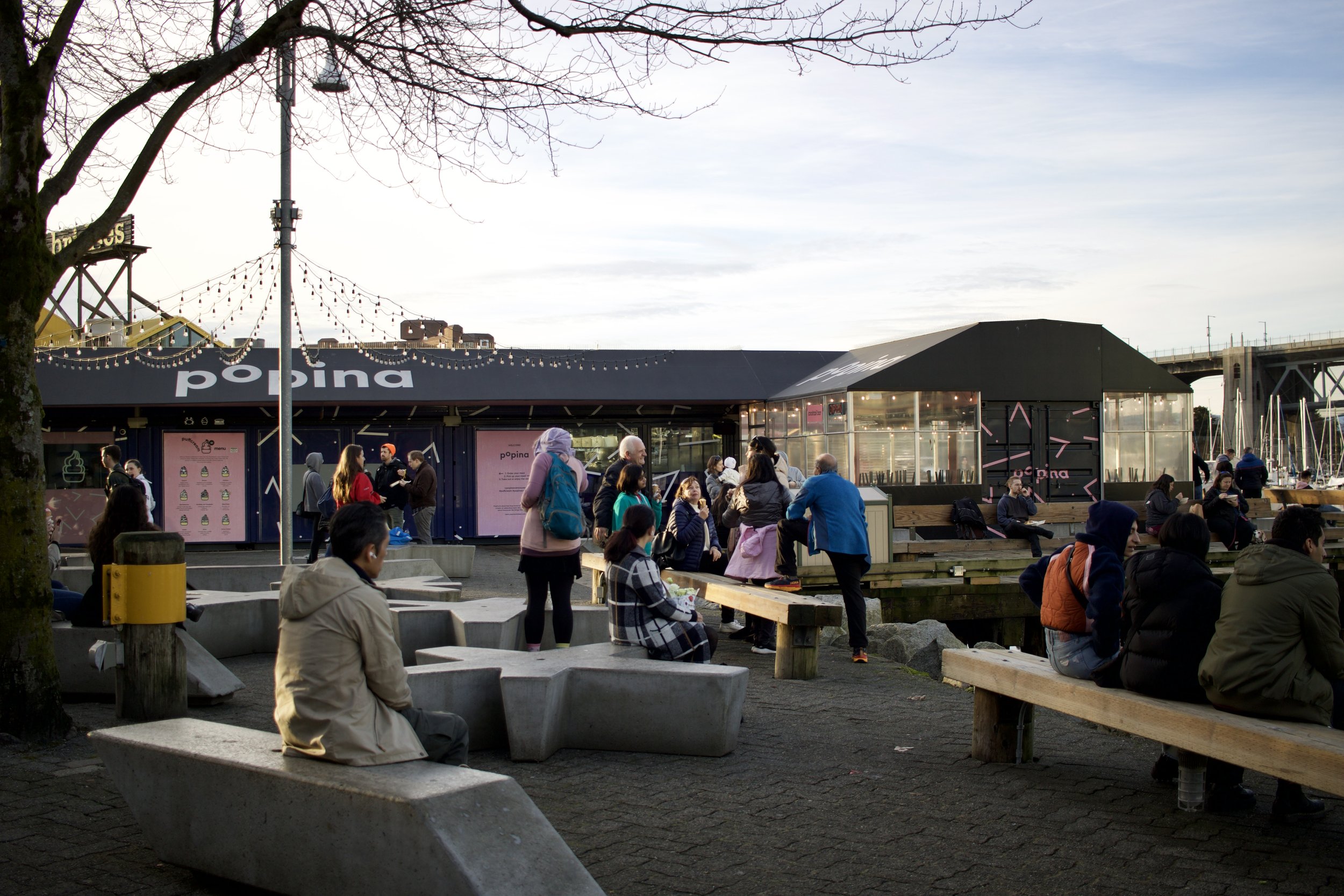 People sitting on concrete platforms and wood benches (Vancouver, BC, taken by Nicole Roach).