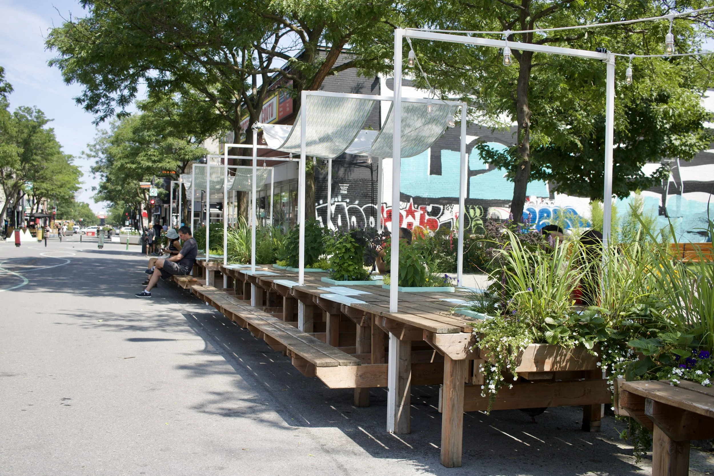 Picnic tables with shading and in-table herbs on an open-street (Montréal, QC, taken by Nicole Roach).