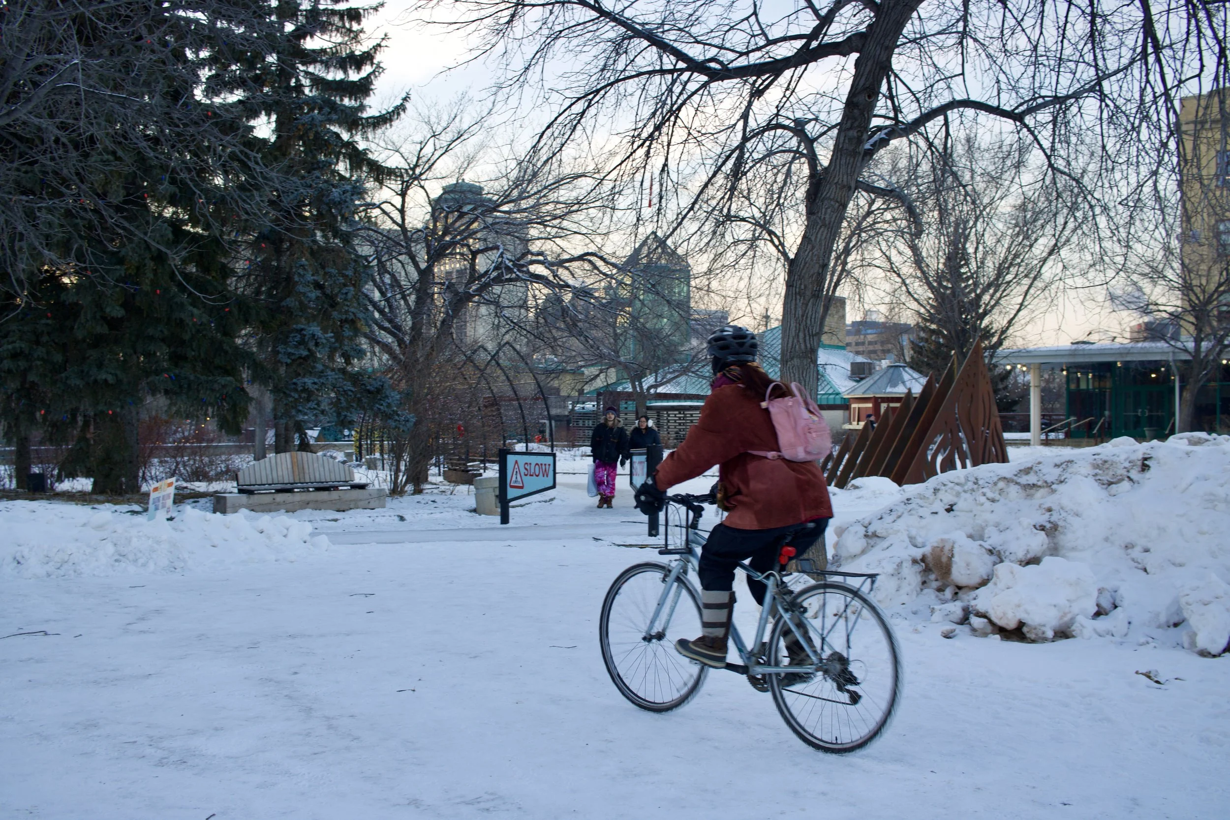Person cycling in winter at The Forks (Photo by: Nicole Roach, Winnipeg, MB)