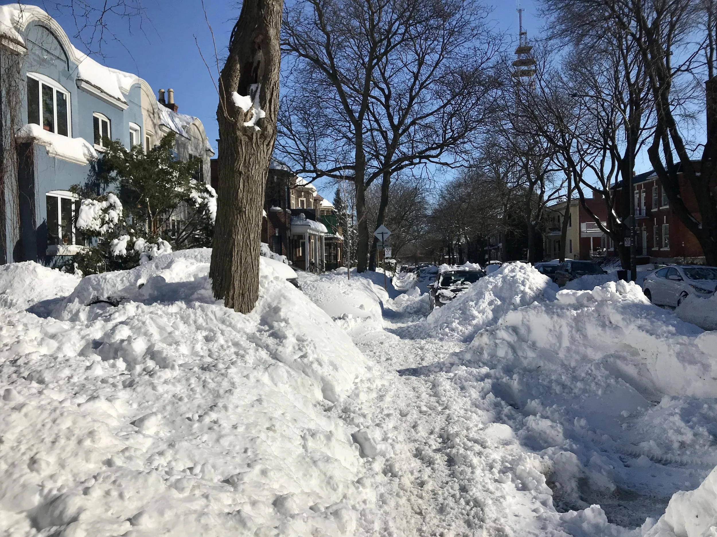 Deep snow on sidewalk and high snow piles (Photo by: Holly Hixson, Montréal, QC)