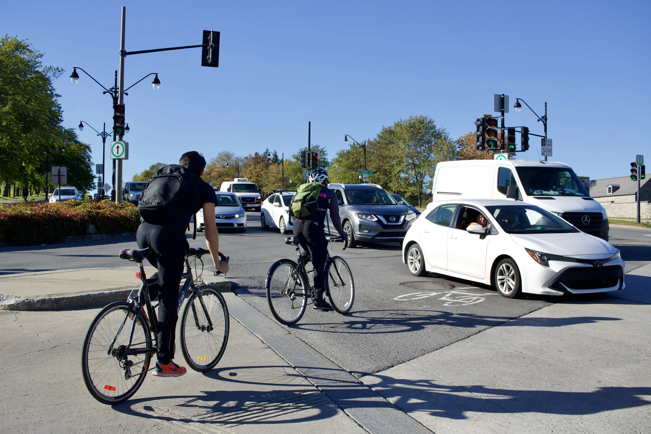 Two people biking through a row of vehicles despite a green light for cyclists (Photo by: Nicole Roach, Montreal, QC, 2022)