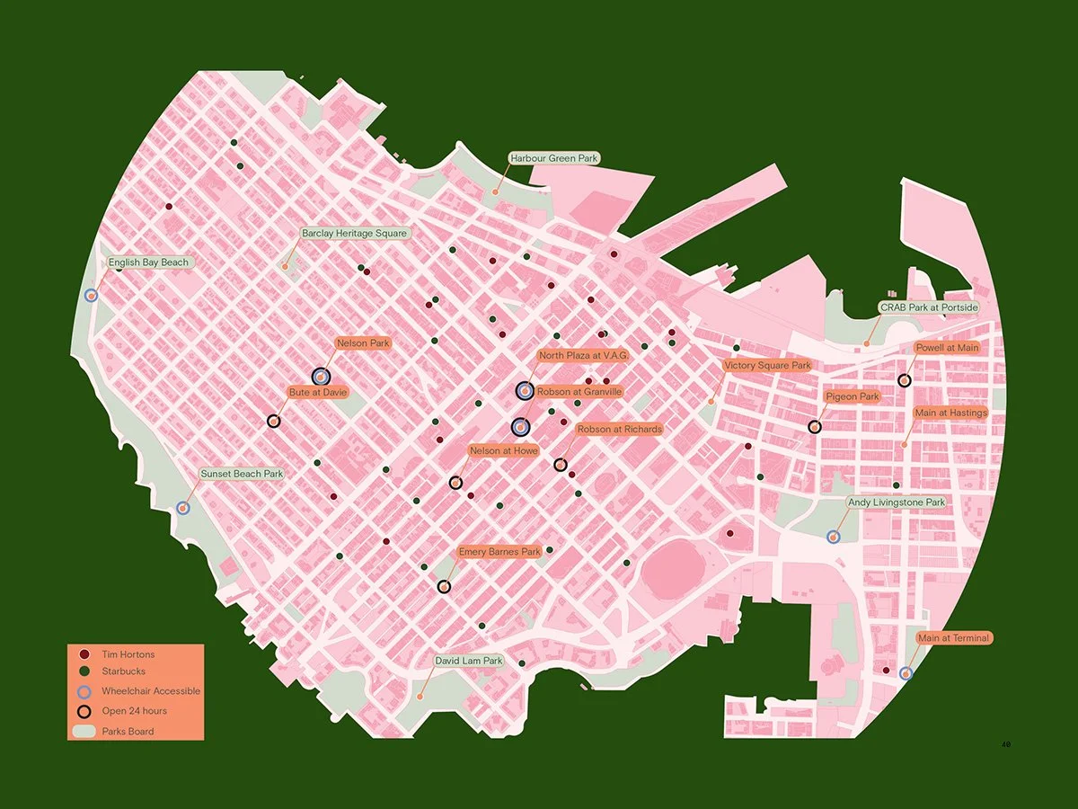 When washrooms are few and far between, women have to travel further distances to access them. In these instances, women may face increased risks, as women are more likely to experience gender-based harassment and violence in public space than men. Furthermore, when women are unable to relieve themselves in private facilities, they may be unfairly fined, and in extreme cases, sexually assaulted or murdered. The availability of washrooms can dictate women’s schedules and travel behaviours, with a UK report finding that 20% of people did not leave their homes as often as they would like because of lack of bathroom access. A map showing the availability of public washrooms (orange labels) in Vancouver compared to customer-only washroom facilities at Tim Hortons and Starbucks locations (red and green dots). Page from Emily Scoular’s thesis via The Tyee.