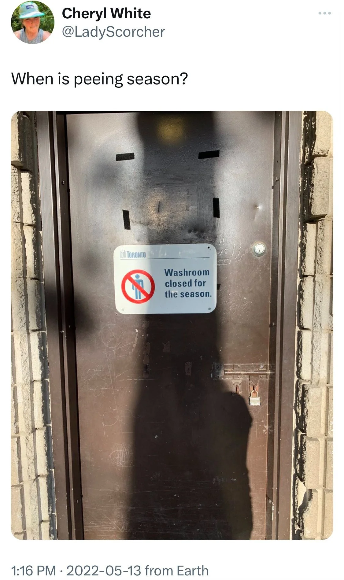 There is already an insufficient amount of public washrooms available in Canadian cities, and this is especially felt in parks, plazas, and other public areas. In addition to this, when public washrooms are available, many municipalities deem them as seasonal-specific facilities , closing them for months of the year. In response to a “washroom closed for the season sign”, Cheryl White cleverly posted on Twitter: “when is peeing season?” (screenshot via Twitter).
